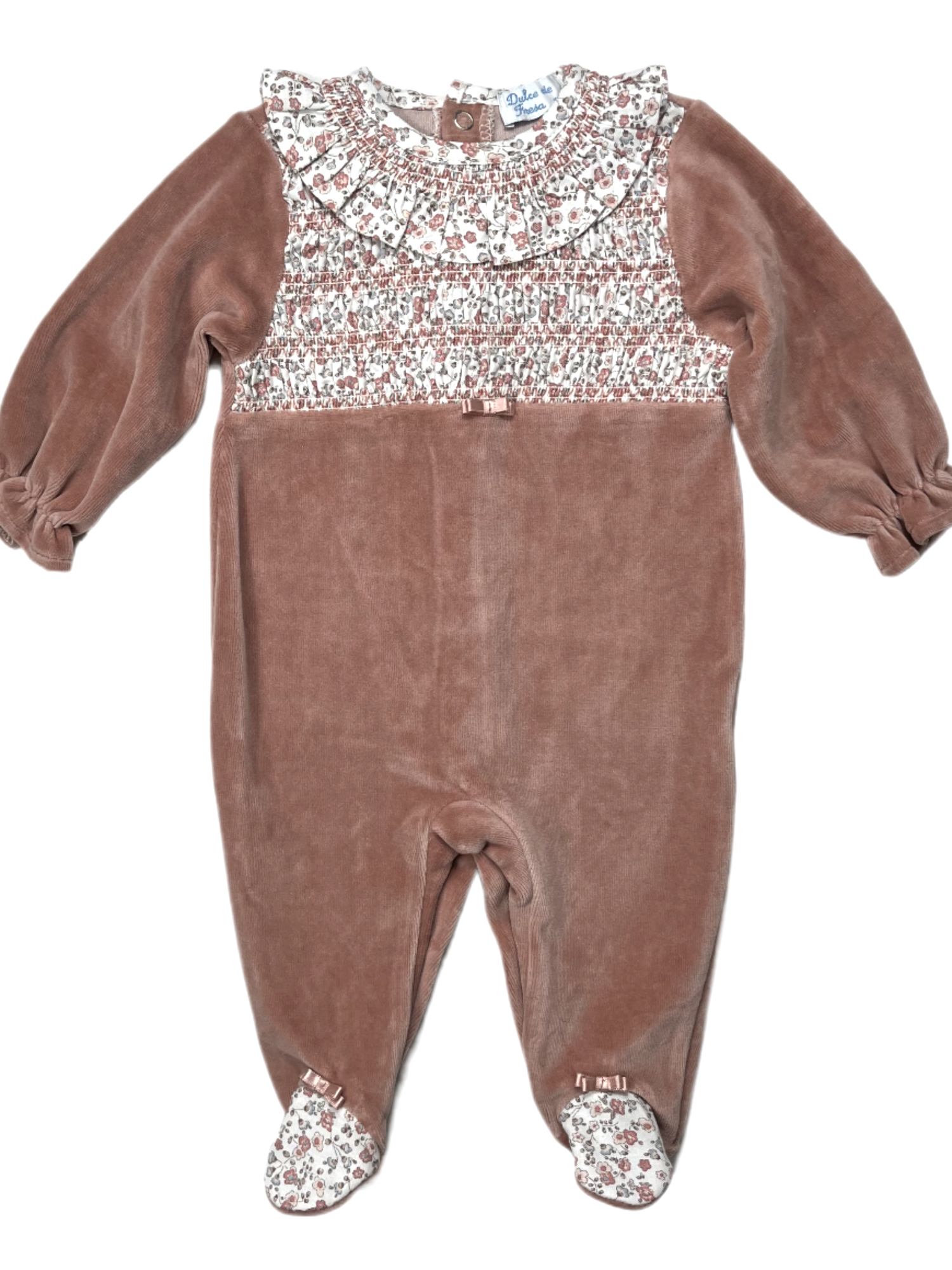 Pyjama bébé en velours Pyjama une pièce à pieds Collerette plate et smocks assortis Fermé par des boutons-pression au dos et le long des jambes Fabriqué en Espagne Ce pyjama taille normalement. Choisissez la taille habituelle.