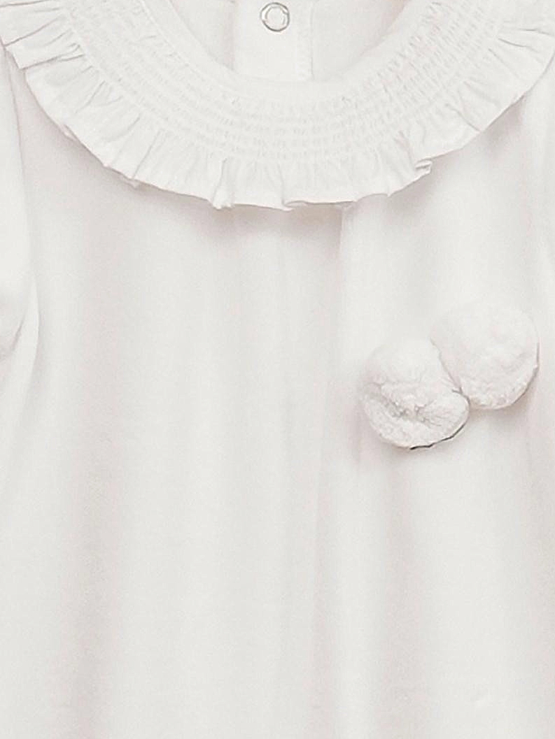 La teinte blanche immaculée, intemporelle et apaisante, incarne une élégance épurée qui convient aussi bien aux moments de détente à la maison qu’aux occasions spéciales. Deux petits pompons délicats viennent orner le devant du pyjama, ajoutant une note ludique et poétique qui séduit autant les parents que les enfants.
