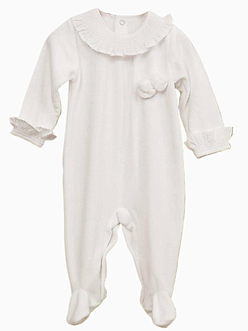 Pyjama bébé mixte en velours Pyjama une pièce à pieds Pompons décoratifs sur le devant Fermé par des boutons-pression au dos et le long des jambes Fabriqué en Espagne Ce pyjama taille normalement. Choisissez la taille habituelle.