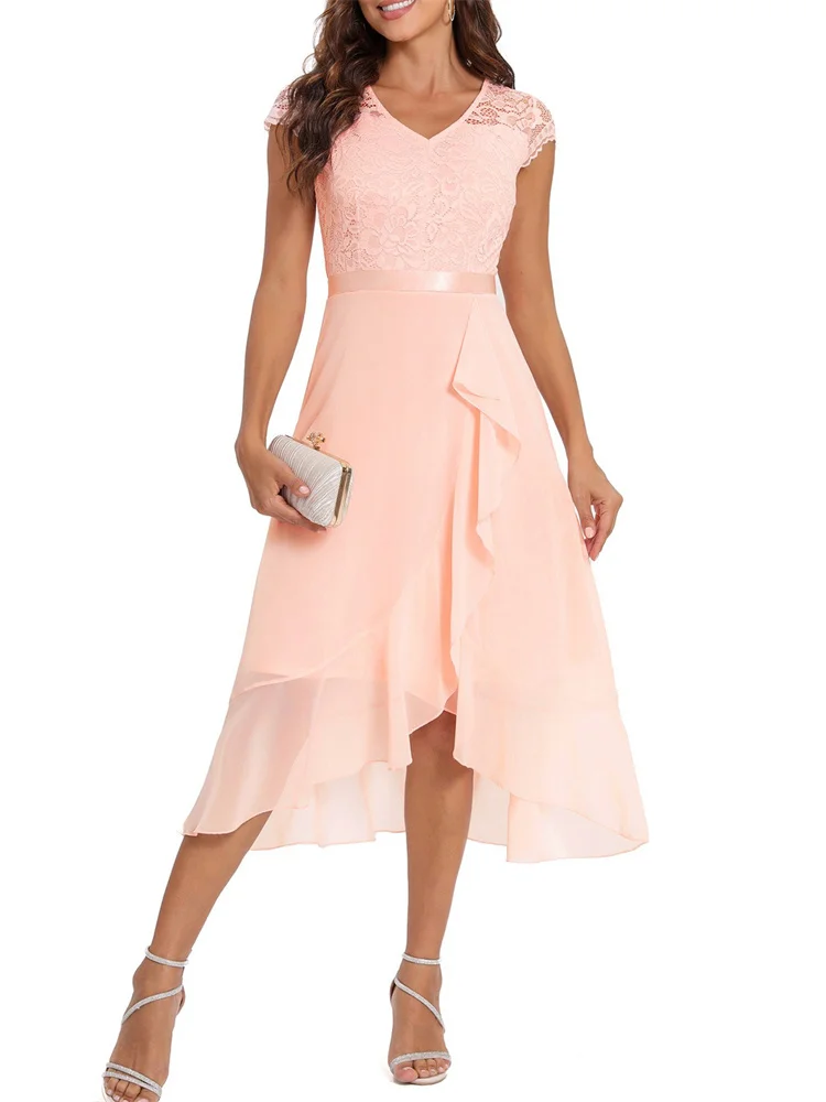 Conçue dans un tissu de qualité, la robe offre une coupe asymétrique tendance qui met en valeur la silhouette. La teinte douce du rose poudré ajoute une touche féminine et raffinée, tandis que les profils en dentelle confèrent une élégance romantique.
