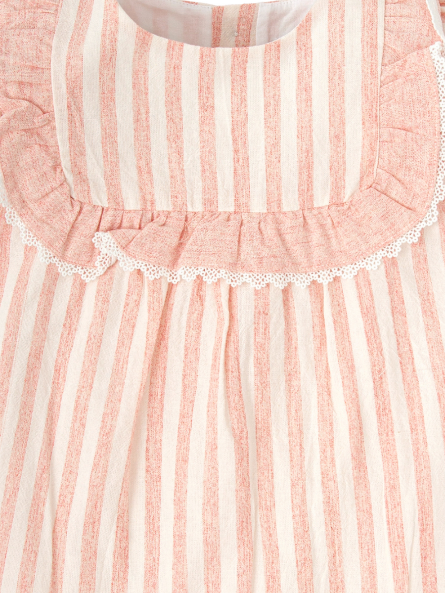 Optez pour une tenue pleine de charme avec notre robe bébé fille rayée rose, confectionnée dans un mélange de coton et de lin. Cette combinaison de matières naturelles garantit une douceur agréable sur la peau délicate de bébé tout en offrant une excellente respirabilité, idéale pour les journées chaudes. Ses rayures roses saumon et blanches délicates ajoutent une note de fraîcheur et de modernité, parfaite pour l’été.