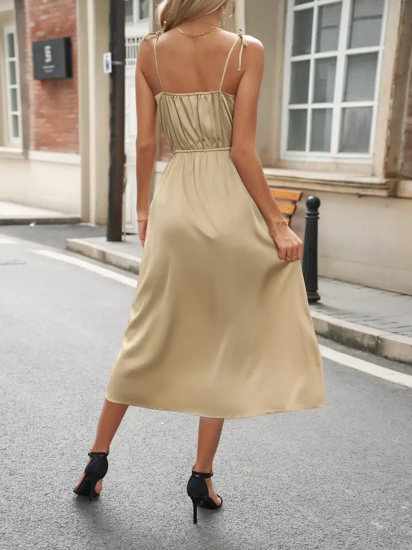 Avec sa coupe raffinée et son tissu fluide, cette robe beige doré promet un confort optimal au quotidien. Sa taille élastique offre une tenue confortable tout au long de la journée, tandis que sa longueur midi assure un charme sophistiqué. Associée à des bijoux dorés ou un sac coloré, elle offrira un look élégant et moderne.