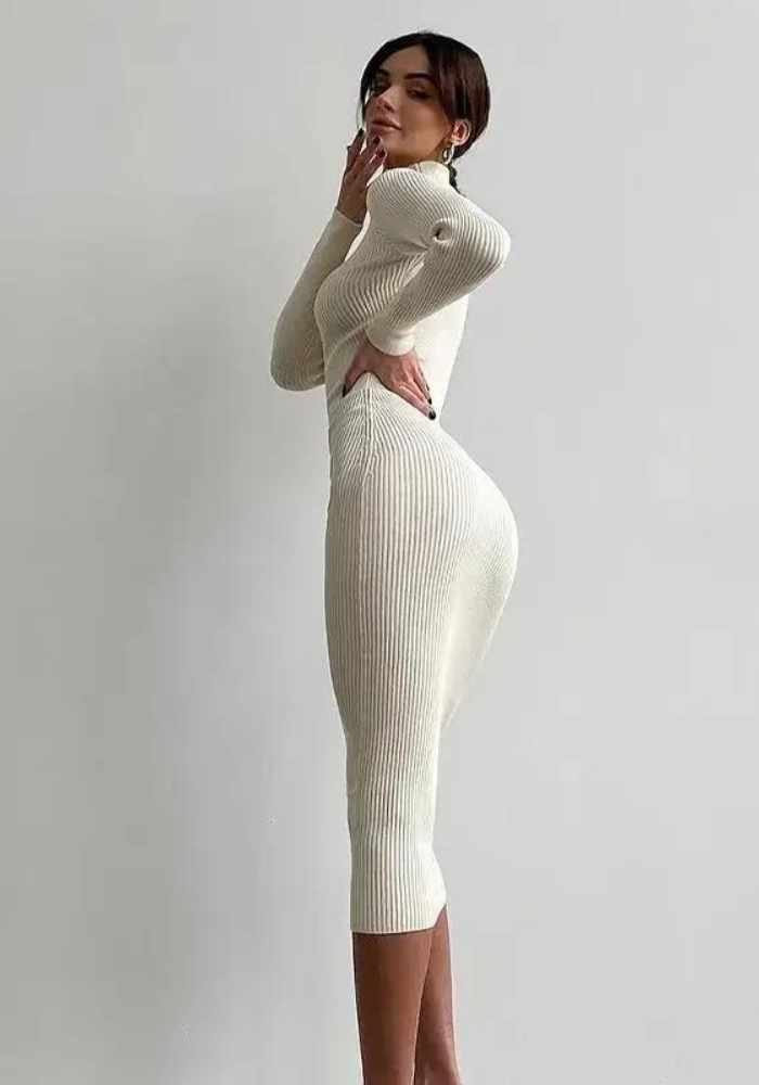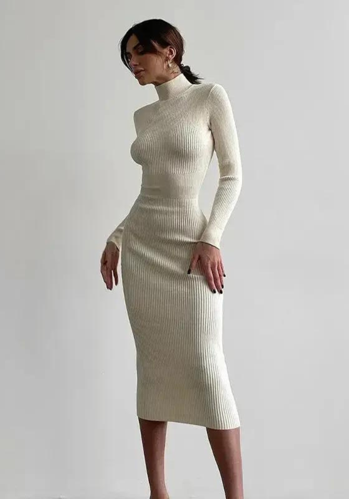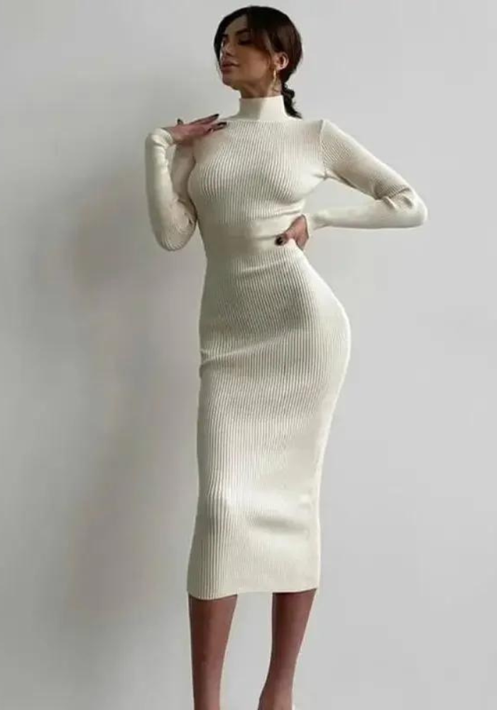 Robe blanche hiver femme à manches longues, col montant et longueur mi-mollet tricotée côtelée