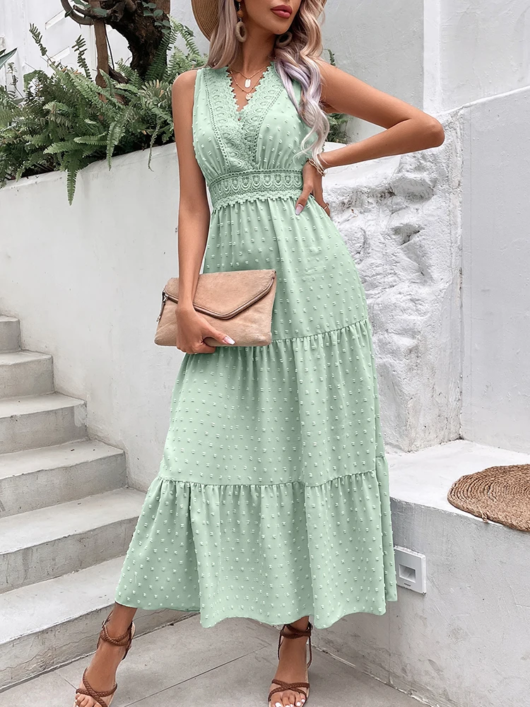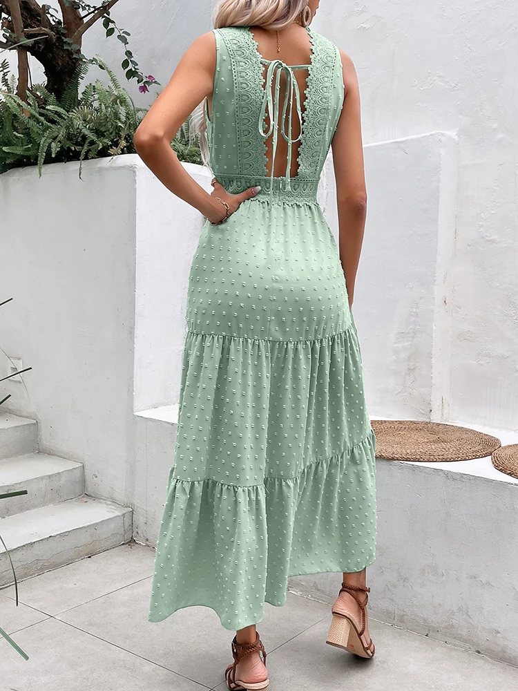 Cette robe arbore une teinte de vert sauge subtile qui s'harmonise parfaitement avec les tendances actuelles. Sa coupe fluide, accompagnée de délicats détails en dentelle, lui confère une touche d'élégance unique, parfaite pour chaque occasion estivale.