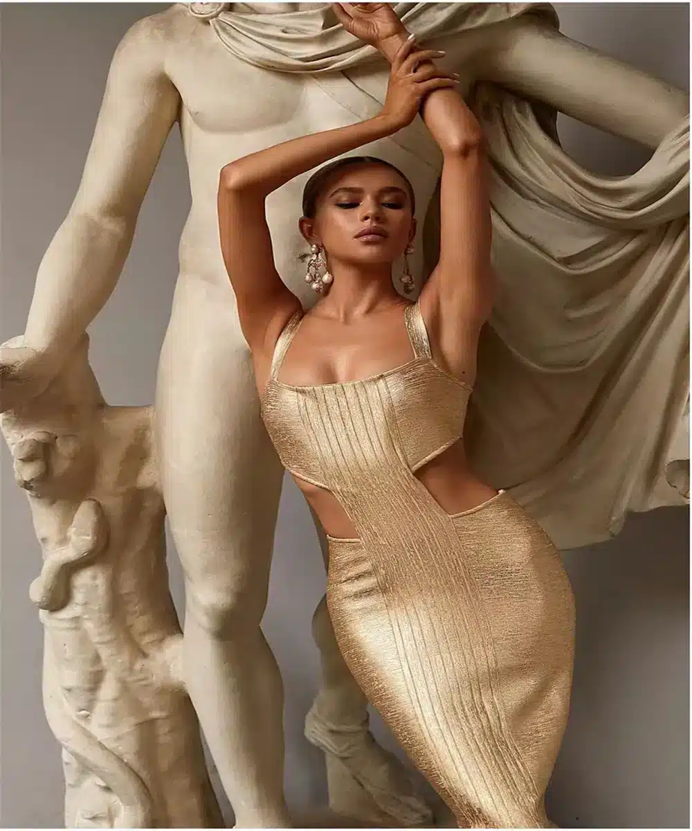 La robe brillante dorée est bien plus qu’un simple vêtement ; c’est une déclaration de style. Grâce à la souplesse de son design, elle s’adapte à une multitude d’occasions et se marie facilement avec vos accessoires préférés.