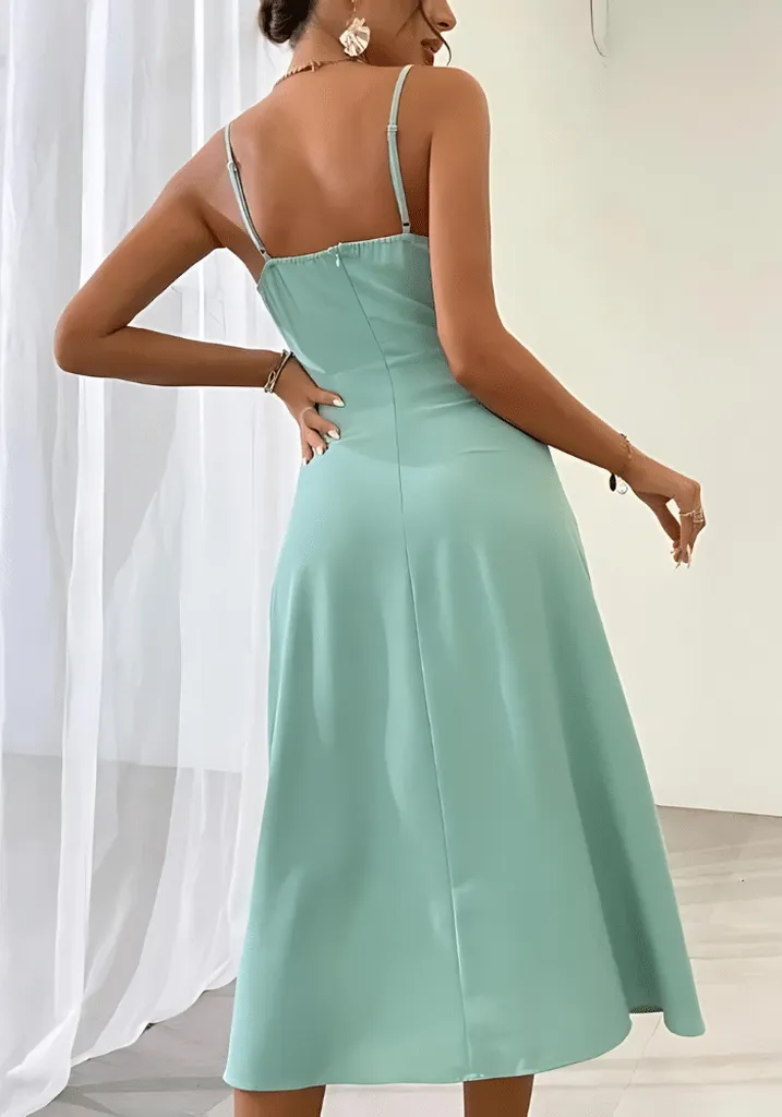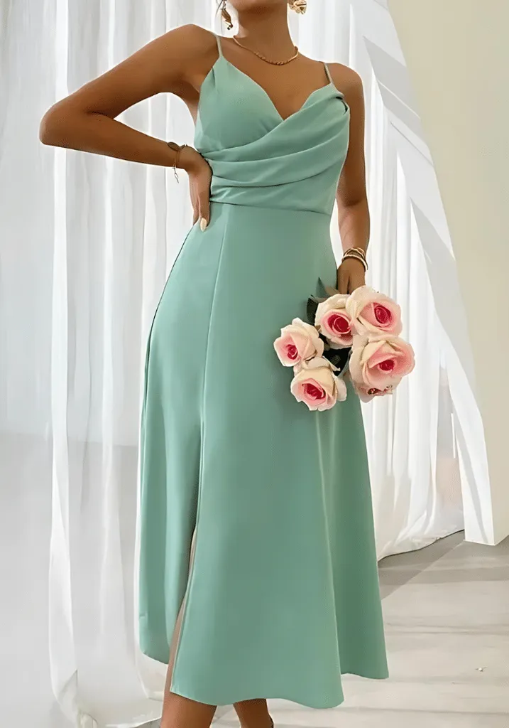 Cette création mi-mollet enveloppe votre silhouette avec une légèreté surprenante, grâce à sa conception en polyester de haute qualité. Son col drapé et ses délicates bretelles spaghetti révèlent une féminité subtile. Complétée d’une discrète fente latérale, elle vous assure une élégance irrésistible à chaque pas.