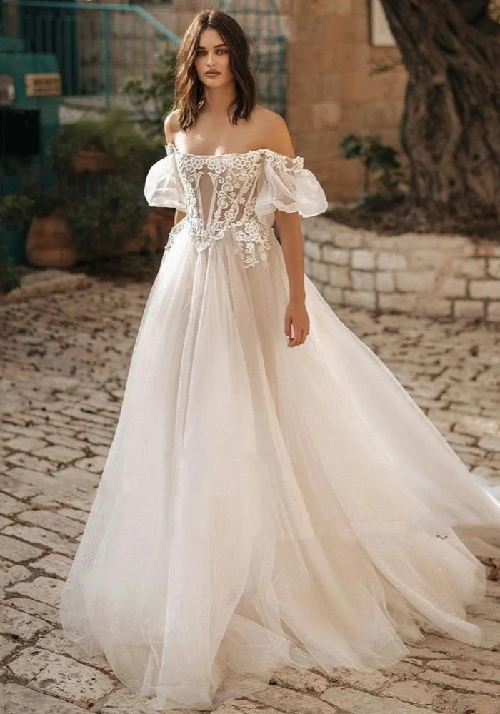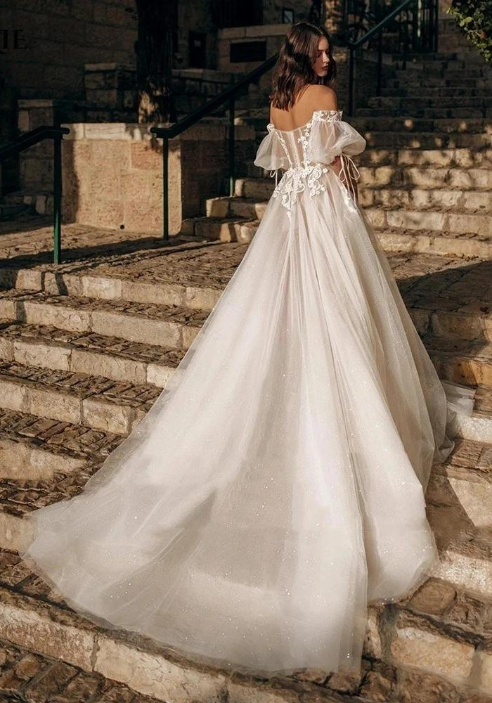 Élégance et romantisme réunis pour votre jour J Coupe trapèze flatteuse pour toutes les silhouettes Dentelle délicate et jupe en tulle aérien pour un look féerique Manches bouffantes ajoutant une touche d’originalité Décolleté raffiné mettant en valeur les épaules Un design unique avec des détails brodés pour un souvenir impérissable