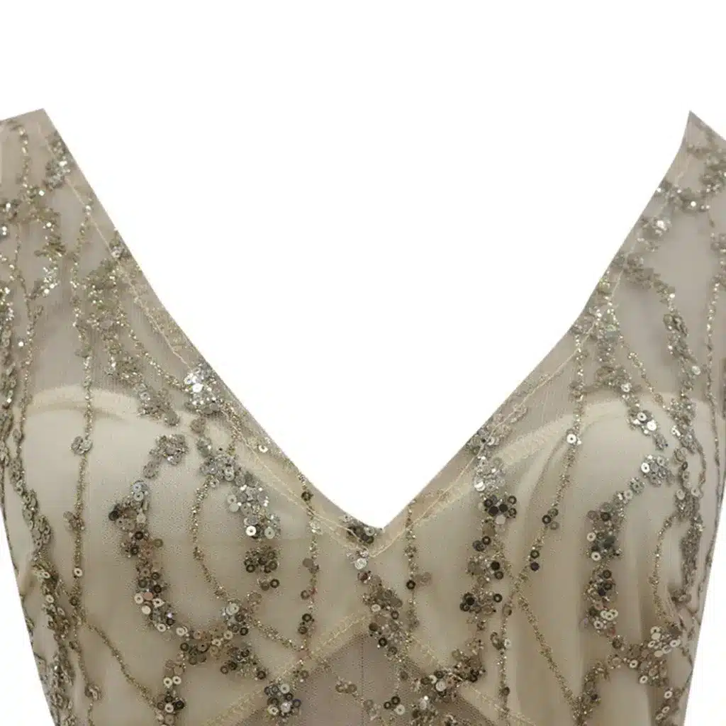 - Détails raffinés : Ornée de perles ou de sequins au décolleté pour un éclat subtil.
