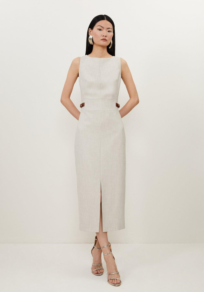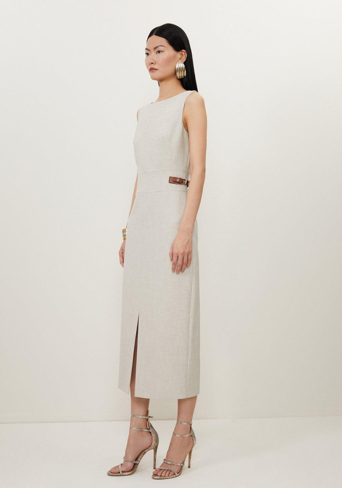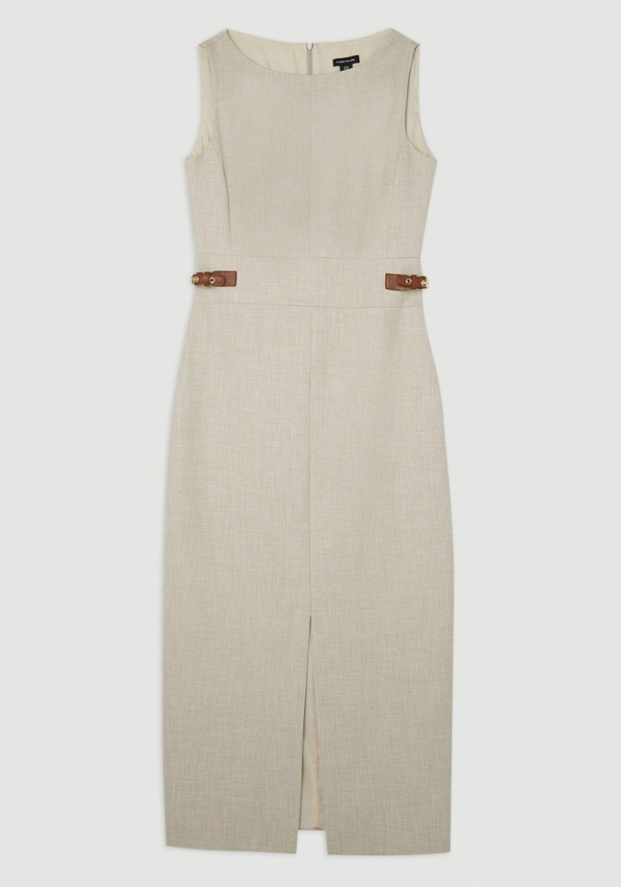Robe droite grise sans manche avec fente et détails marron pour femme