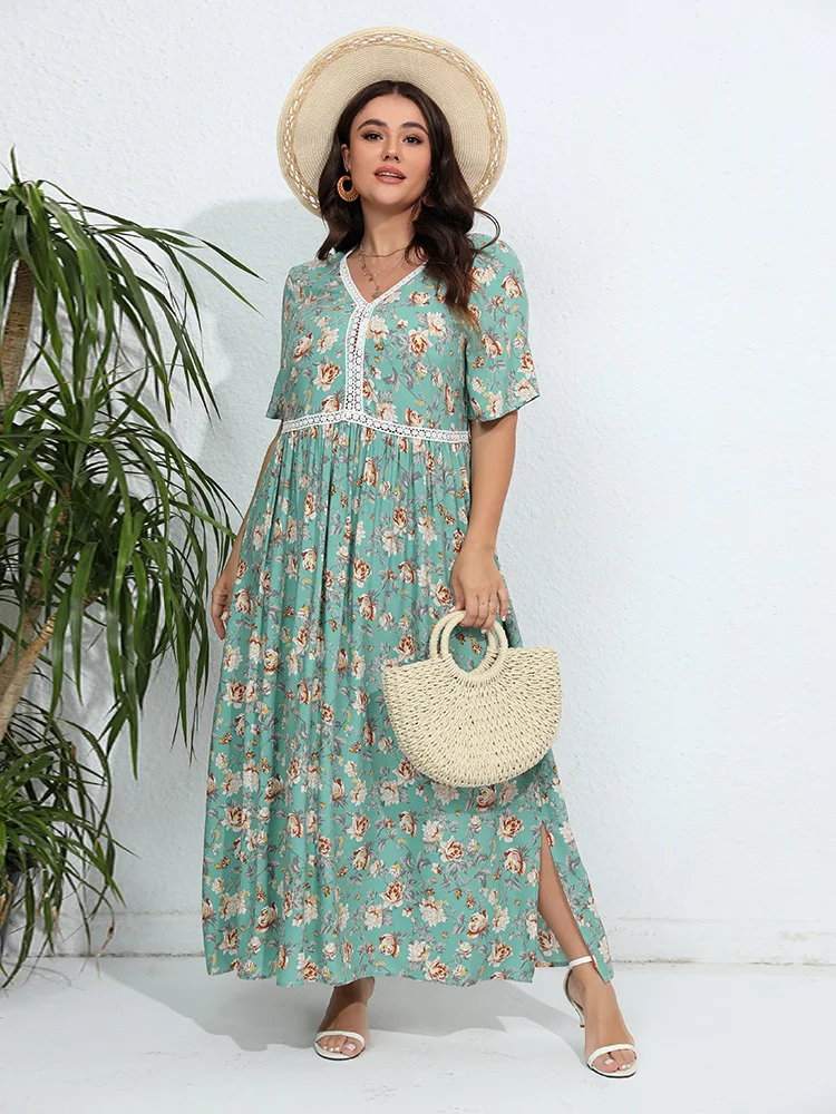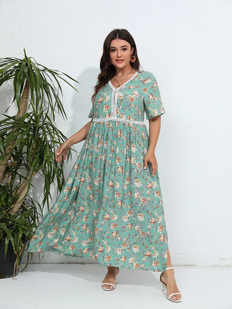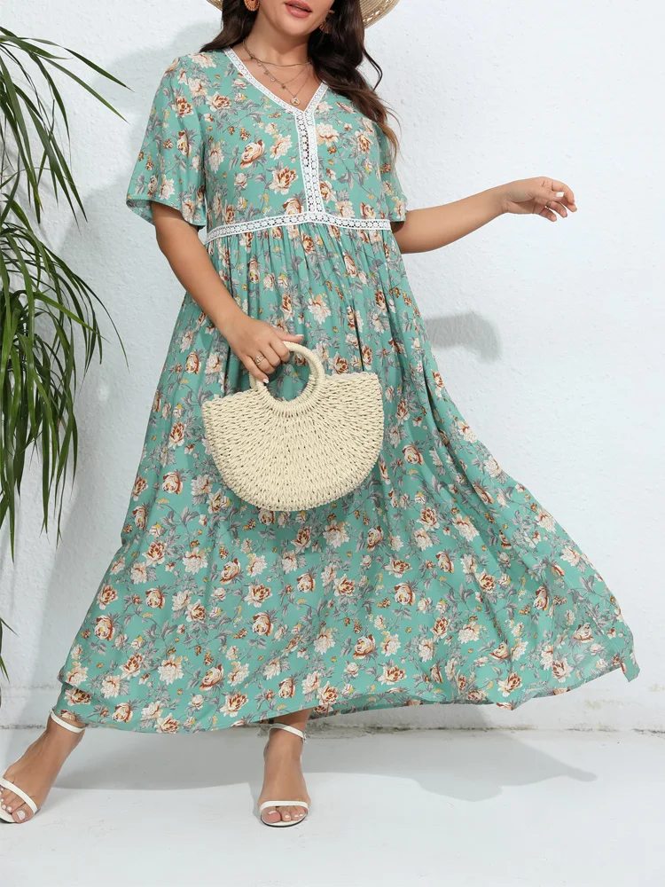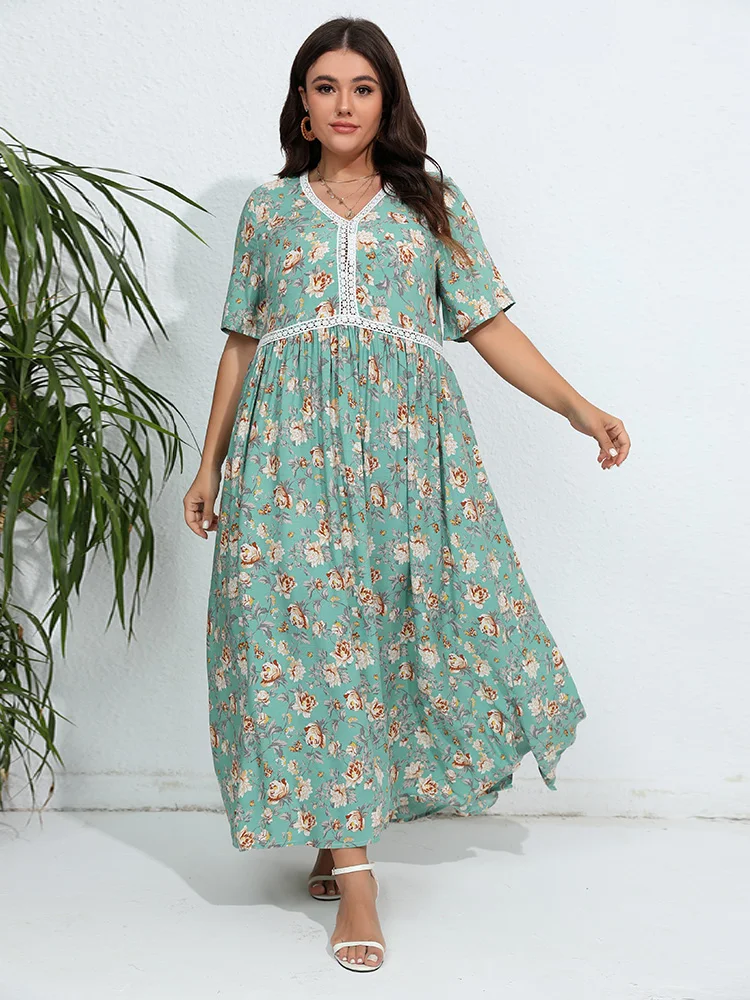 Robe fleurie verte grande taille avec manches courtes : Aurora