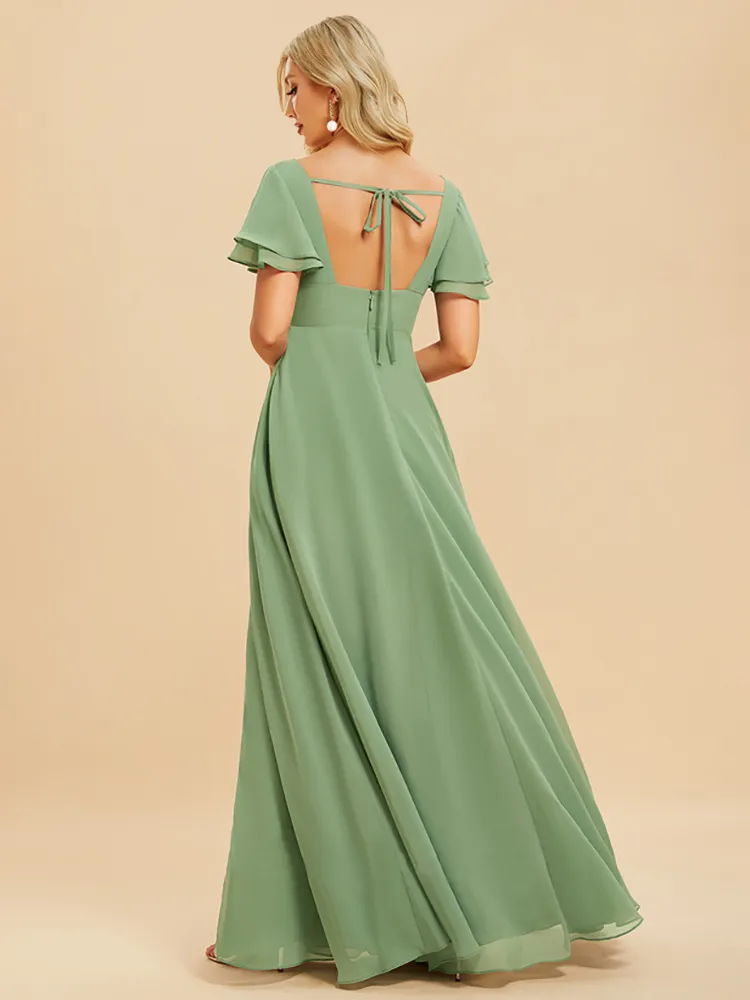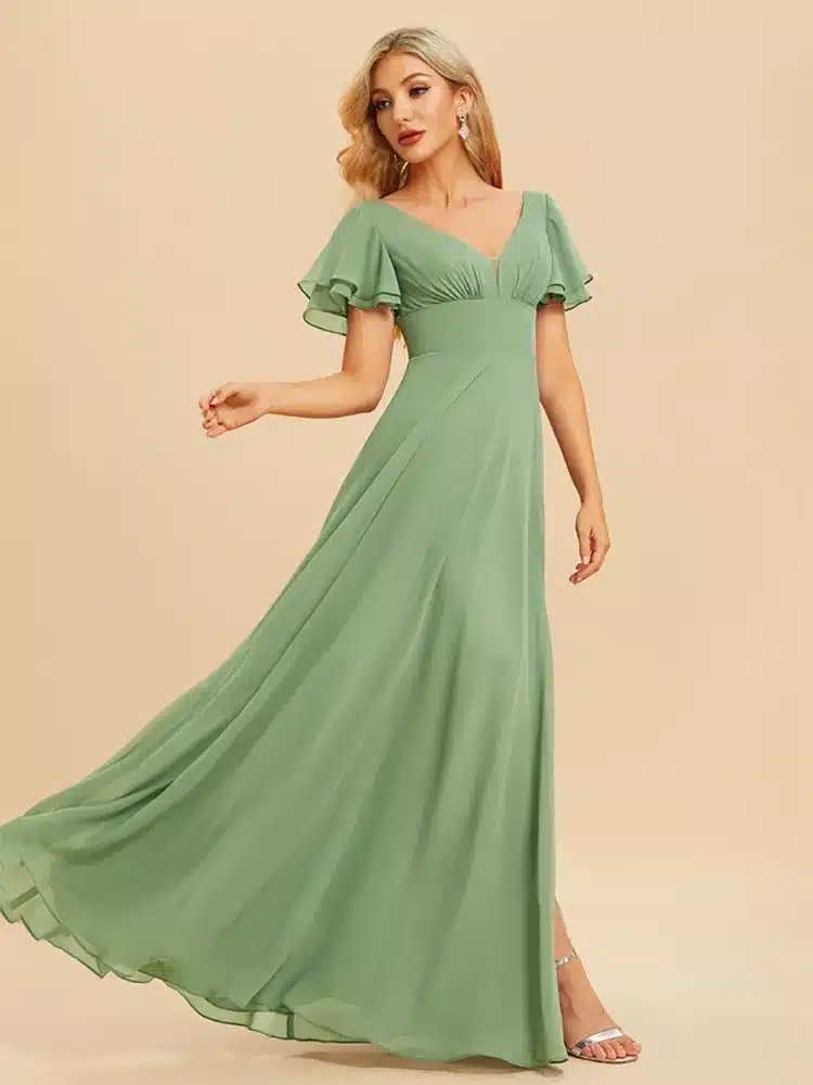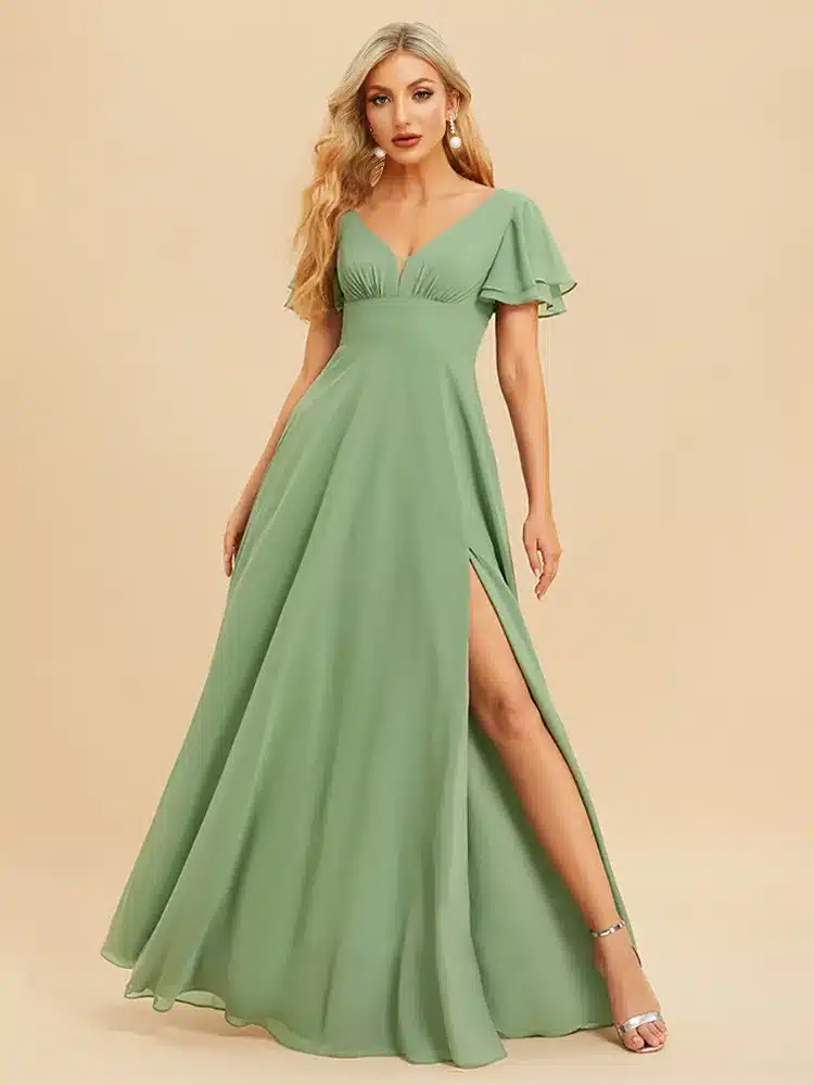 La robe mousseline vert d’eau présente une coupe empire qui flatte la silhouette, agrémentée d’un décolleté en V et de manches papillon pour une touche romantique. Sa teinte vert d’eau est à la fois apaisante et élégante, idéale pour des événements estivaux ou des sorties quotidiennes. Ce style classique se marie à merveille avec différents accessoires, vous permettant d’adapter votre tenue à l’occasion.