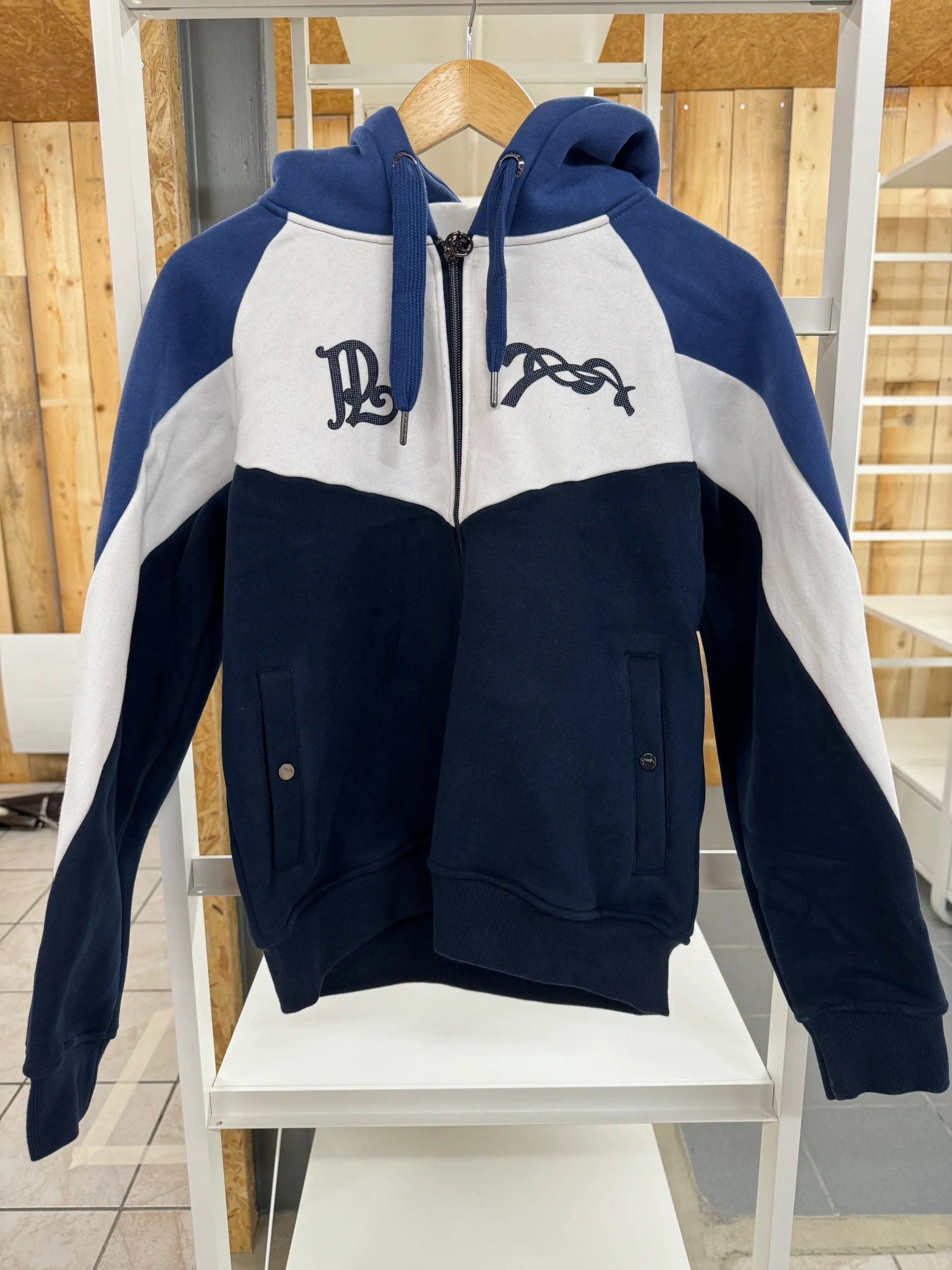 Sweat-shirt New Twister PENELOPE zippé sur le devant et composé de deux poches sur le devant qui se ferment par des pressions. Esprit color block car composé de trois couleurs : bleu lumière sur la capuche et le haut des épaules, blanc sur le haut du sweat et marine sur le reste du corps. A l’avant, sur le cœur et à droite, le monogramme PL et le logo Pénélope se répondent dans un joli glitter perforé marine.