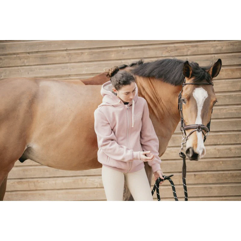 Sweat-shirt « Tressy » rose, bien épais et zippé sur le devant. Il est doté d’une grande capuche doublé de polaire ultra douce de laquelle sort deux cordons beige pour un ajustage facile. Il est également doté de deux poches sur le devant qui se ferment, elles aussi avec un zip. Sur le cœur, un logo Pénélope en strass complète le look de ce sweat très girly.
