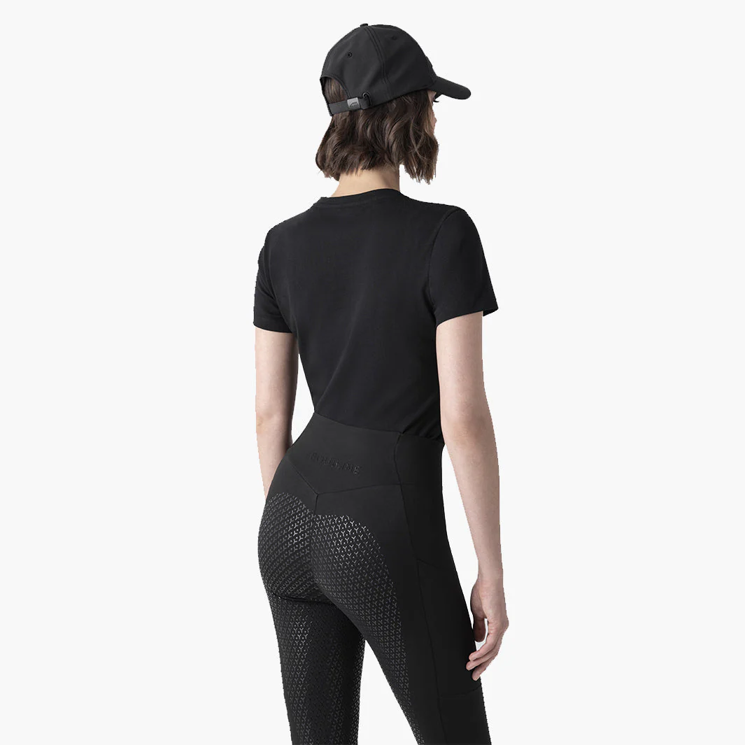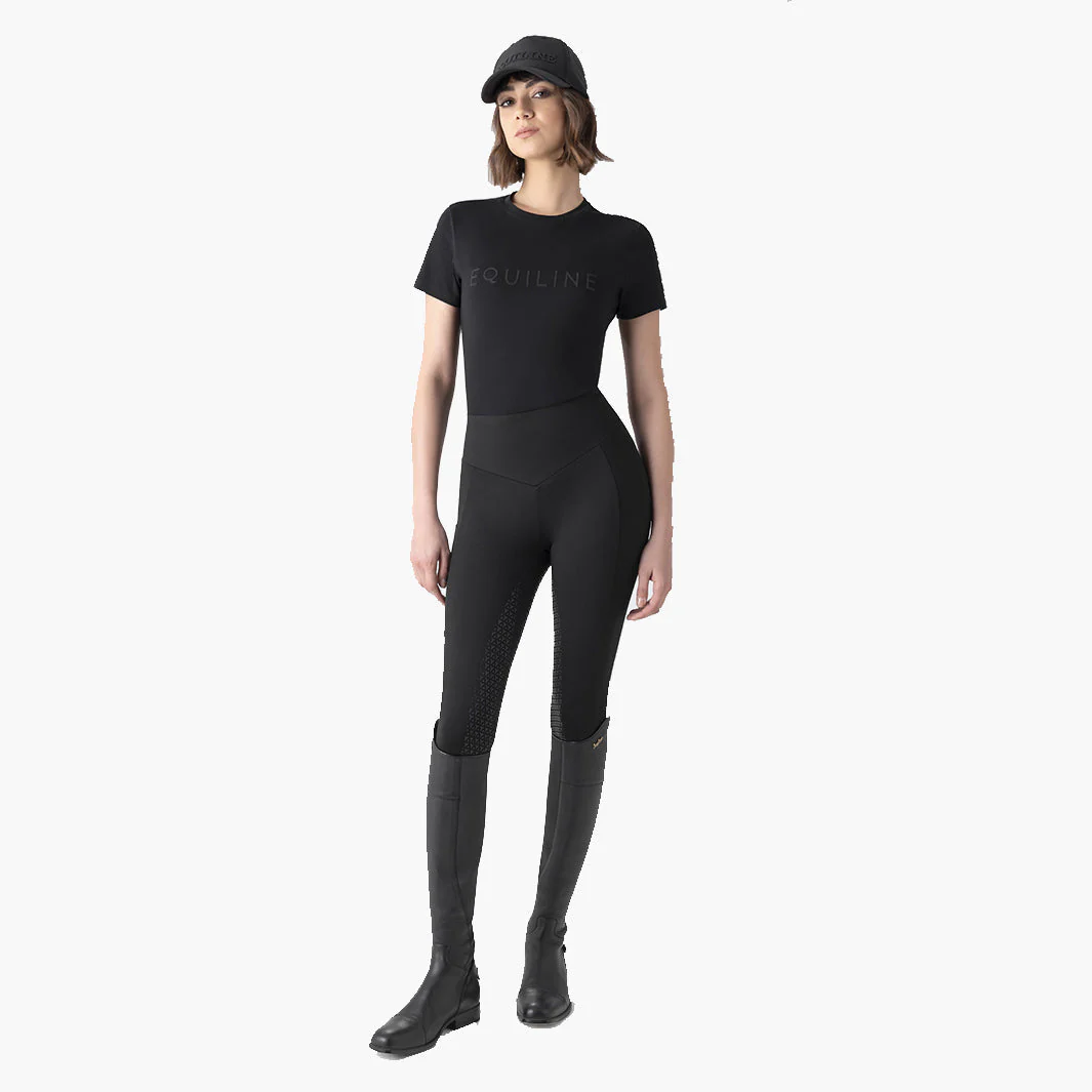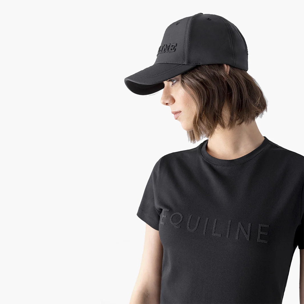 Le col rond classique apporte une touche intemporelle et s’accorde aussi bien avec une veste d’entraînement qu’avec une tenue casual. Le détail qui fait la différence: le logo Equiline sur la poitrine, écrit en lettres ornées de strass noirs en cristaux, qui apporte une élégance subtile sans ostentation.