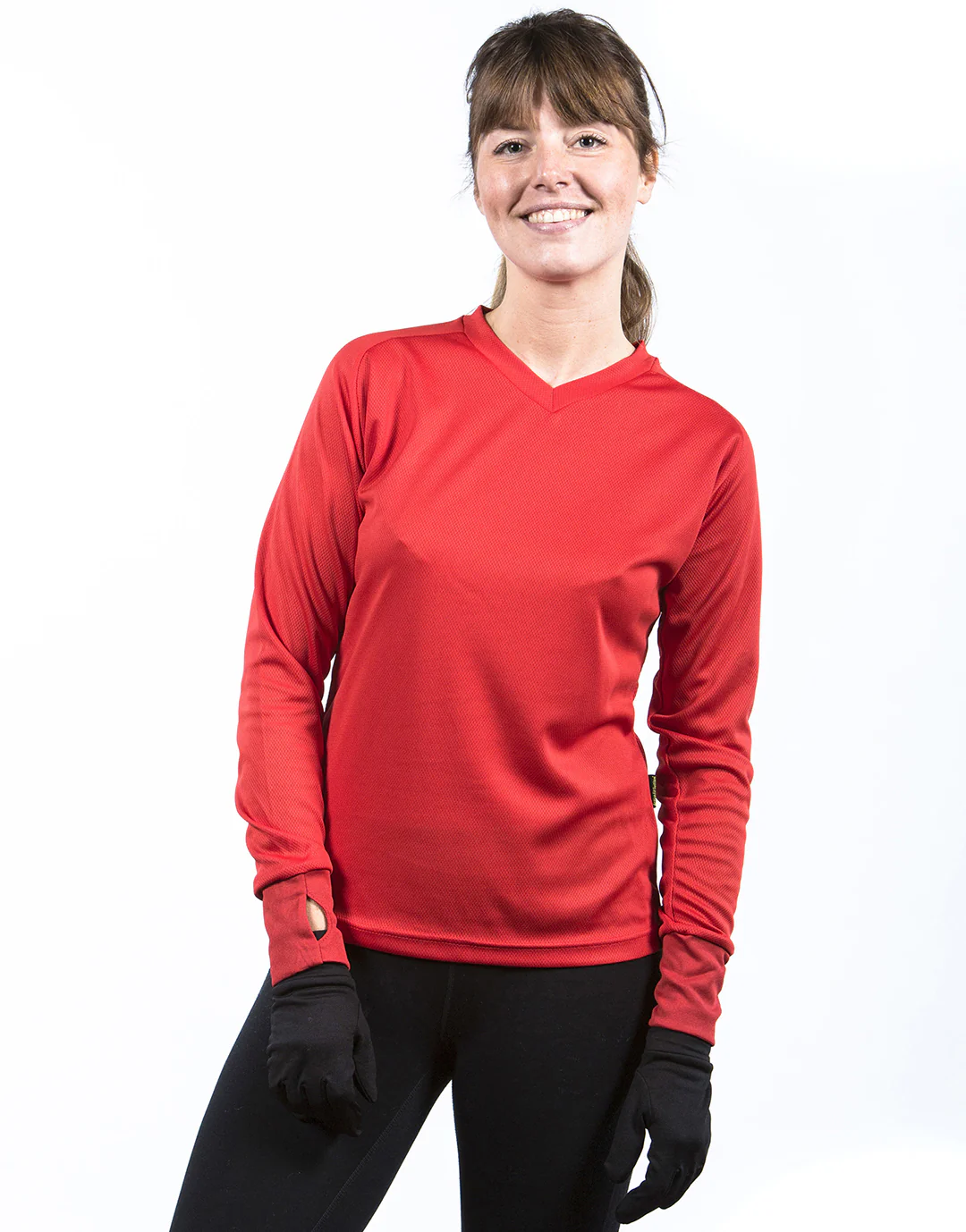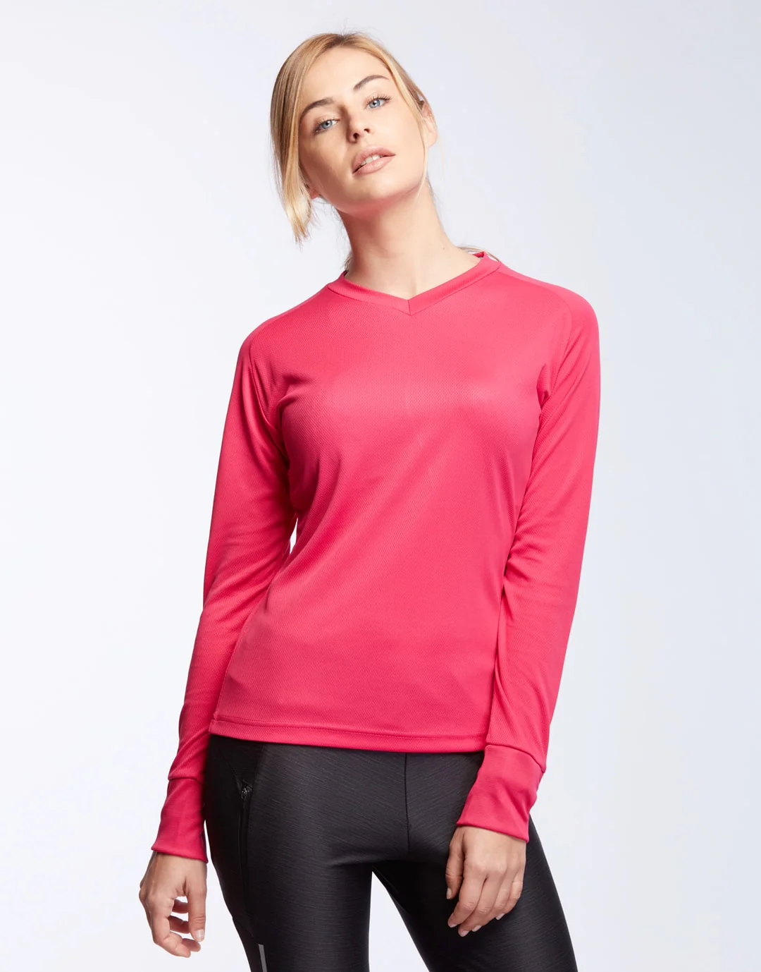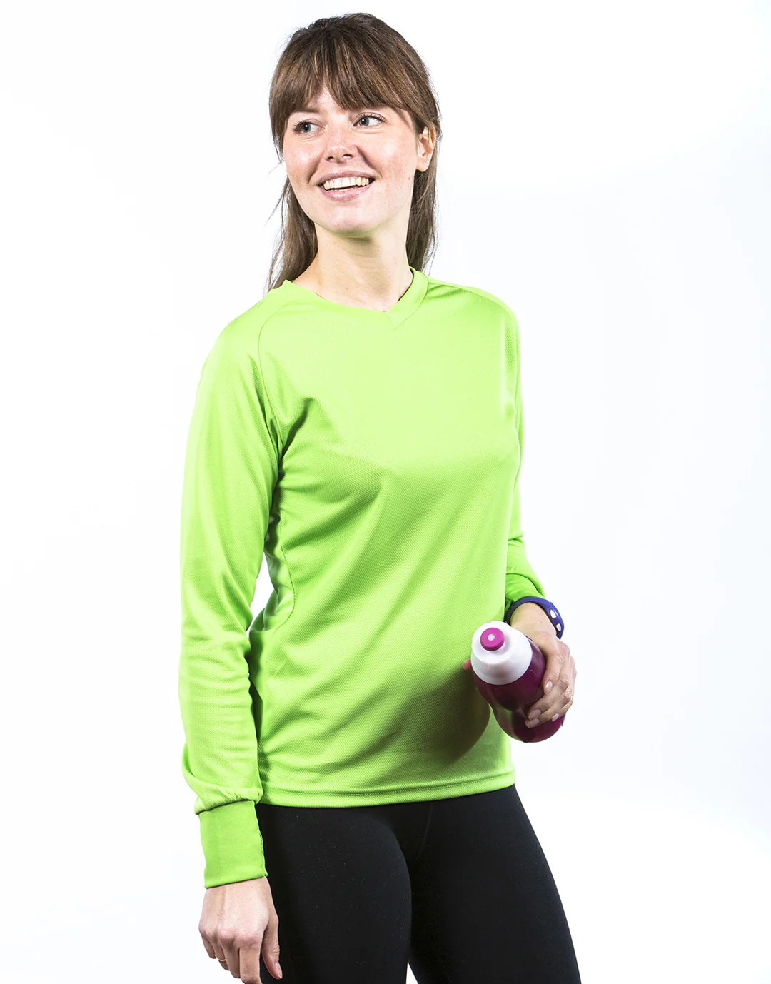 T-Shirt Femme à Manches Longues. Technique et respirant, il est adapté à la course en période fraiche et humide. Le passage au niveau du pouce empêche la pénétration du vent à l’intérieur et garder le corps au chaud. Respirant, il évacue la transpiration pour rester sec tout au long de l’effort.
