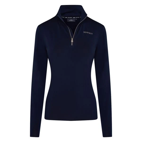 Pull sportif avec fermeture éclair centrale devant * Style ajusté * Extensibilité dans les 4 directions * Intérieur brossé * Respirant * Col haut avec détail en tissu fantaisie à l’arrière * Artwork HV Polo en strass sur la poitrine, à gauche du porteur * Logo Horses en impression feuille centré à l’arrière, sous l’encolure