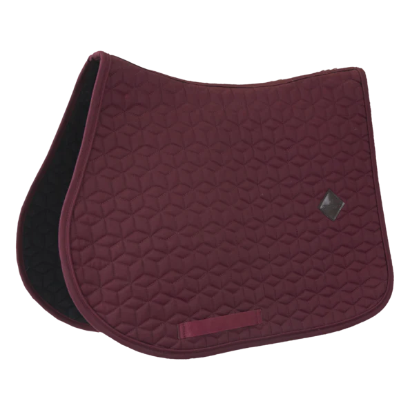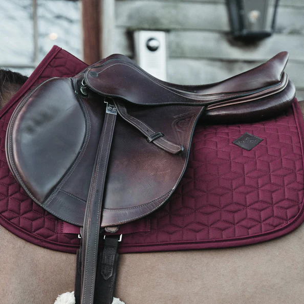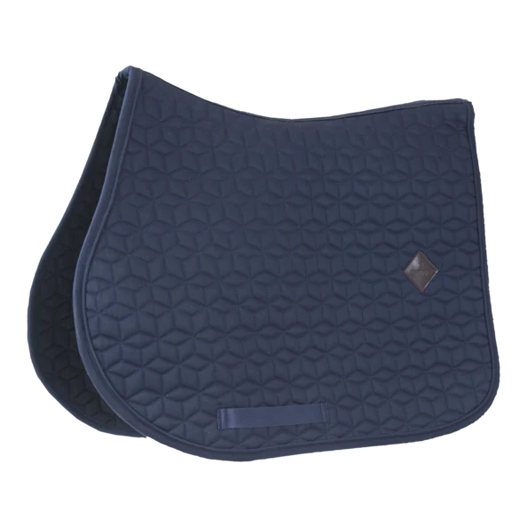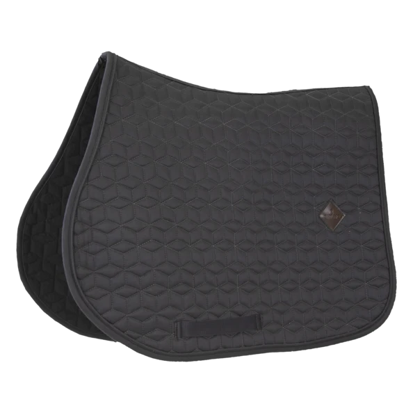 L’extérieur du tapis de selle est fabriqué à partir d’un polyester ressemblant à du coton et a un design chic de matelassage en forme carré. Sur le côté gauche du tapis de selle se trouve un petit patch en cuir vegan avec le logo Kentucky. Sous le logo, il y a suffisamment d’espace pour une broderie. La doublure du tapis de selle est un mélange coton-polyester qui évacue l’humidité.