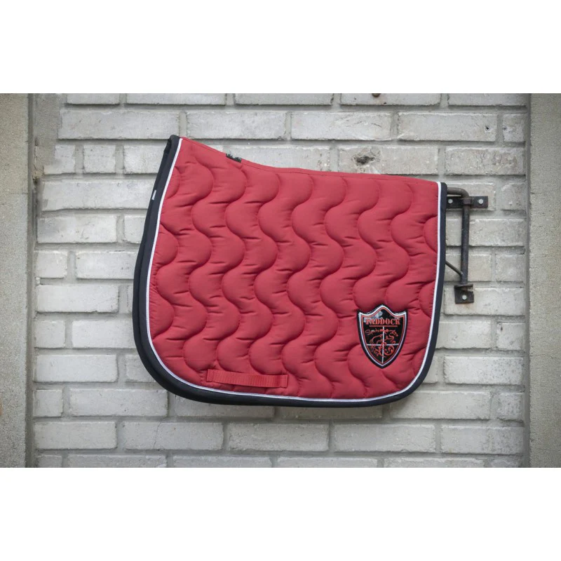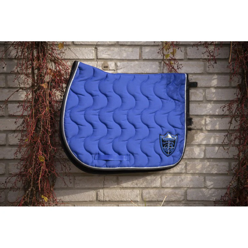 Tapis de selle fabriqué en France doublé en coton nid d’abeille. Le motif est en forme de vague à la verticale. La forme permet de bien dégarrotter le tapis et la selle. Il y a un passant de sange de chaque côté du tapis. Le tapis est composé de deux épaisseurs de mousse différentes, et d’un tissu en nid d’abeille au contact de la peau du cheval pour une meilleure évacuation de la transpiration. Il y a un écusson du coté gauche du tapis assorti aux coloris du tapis.