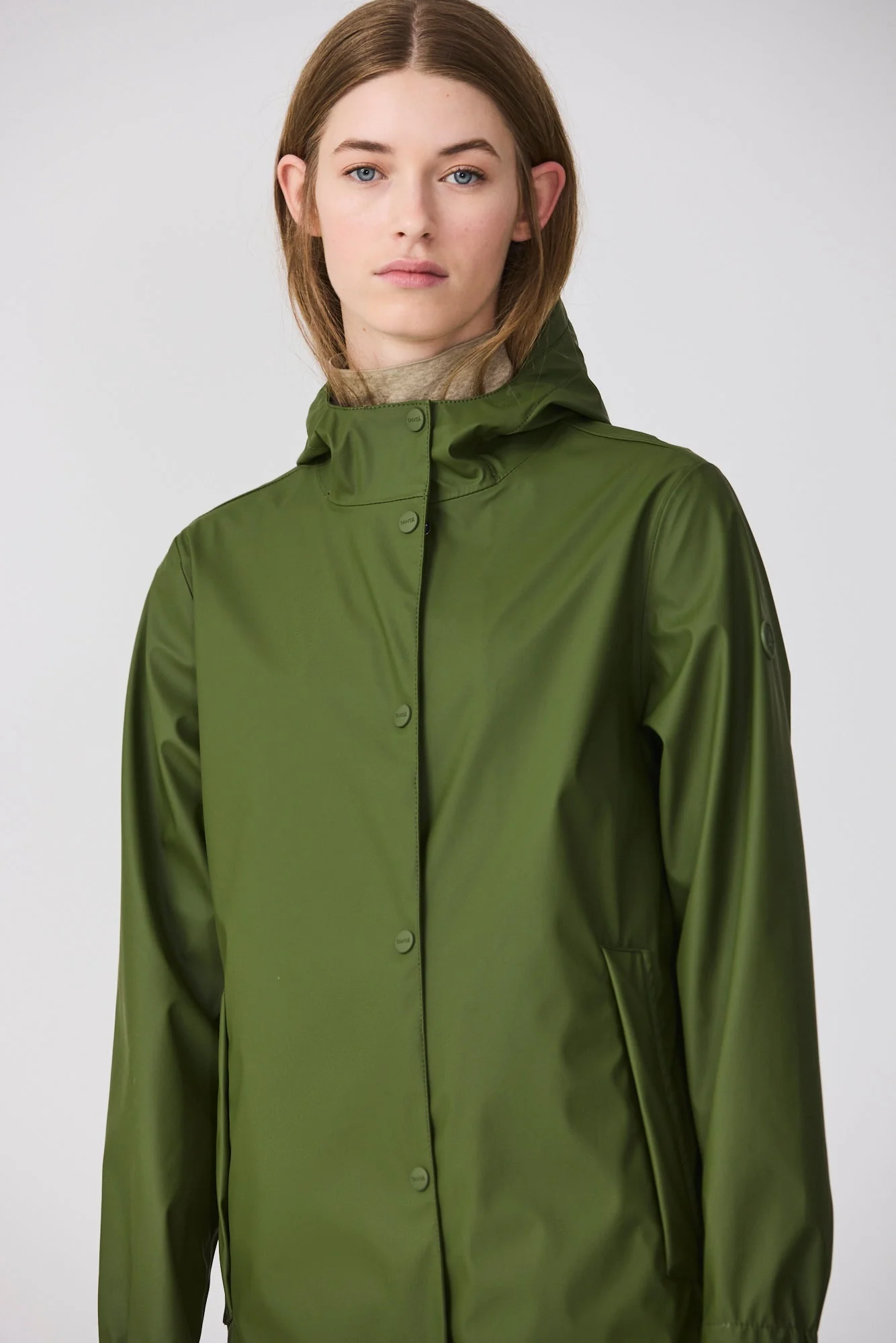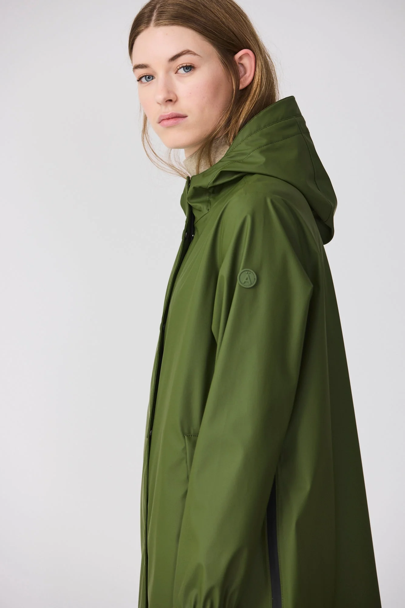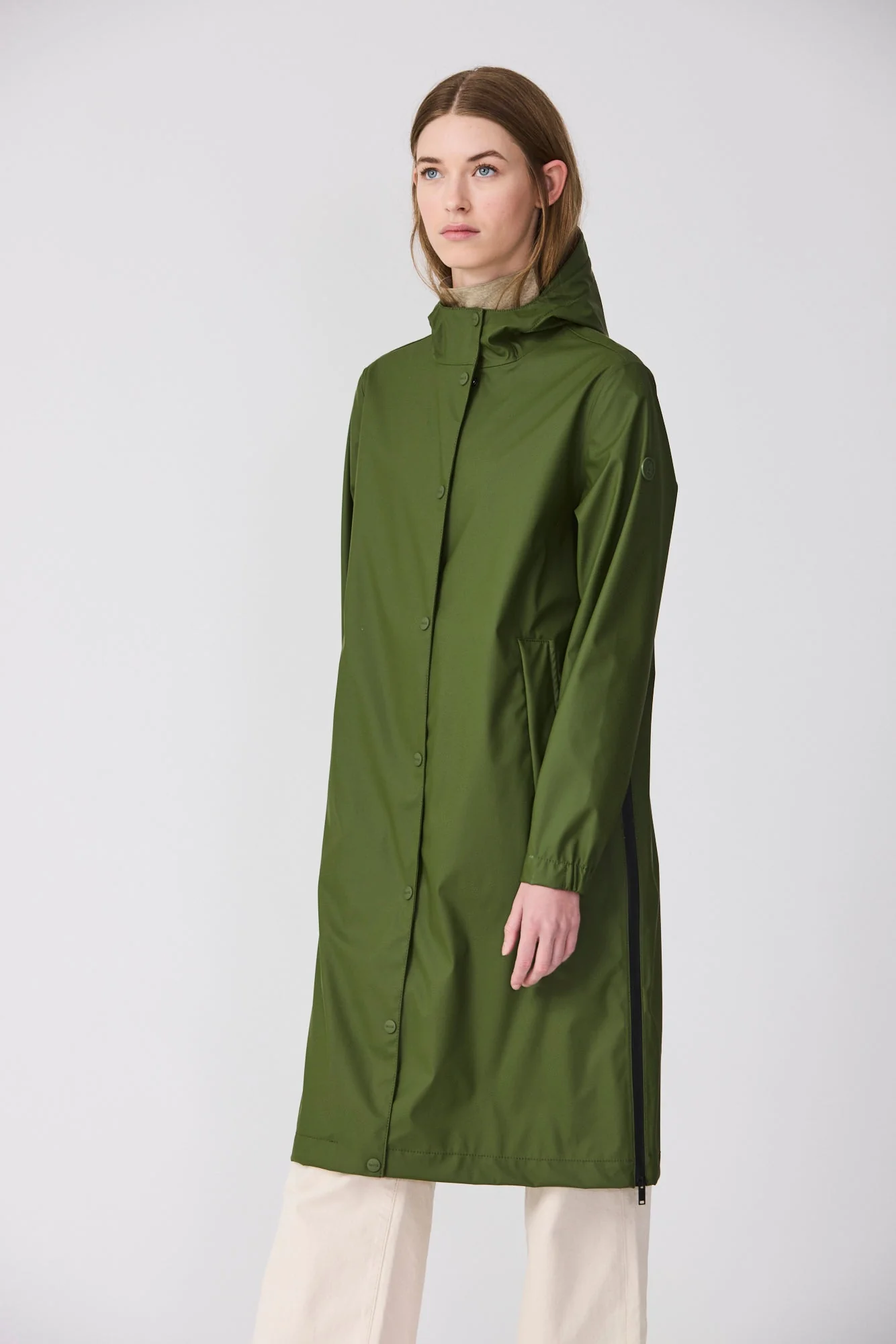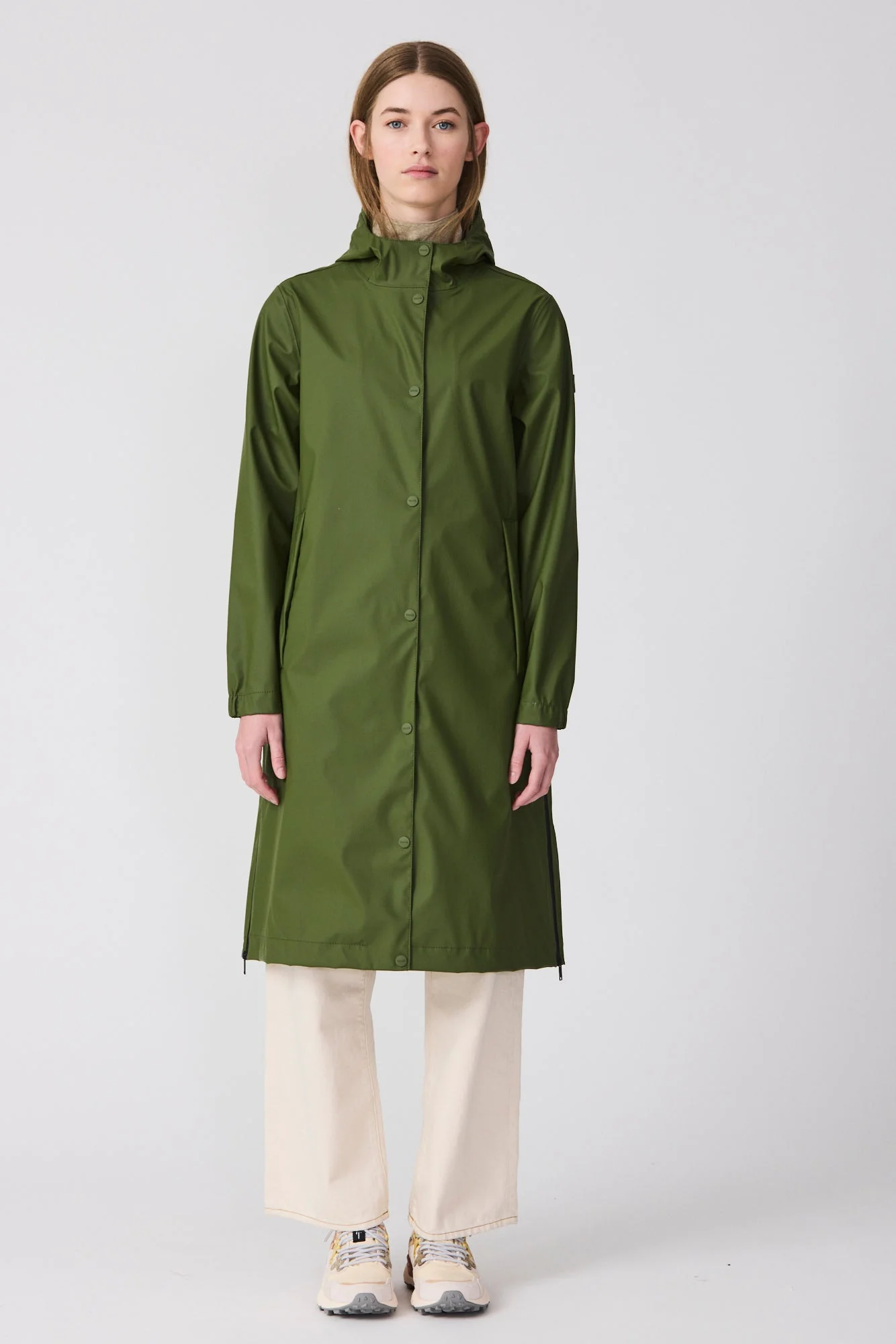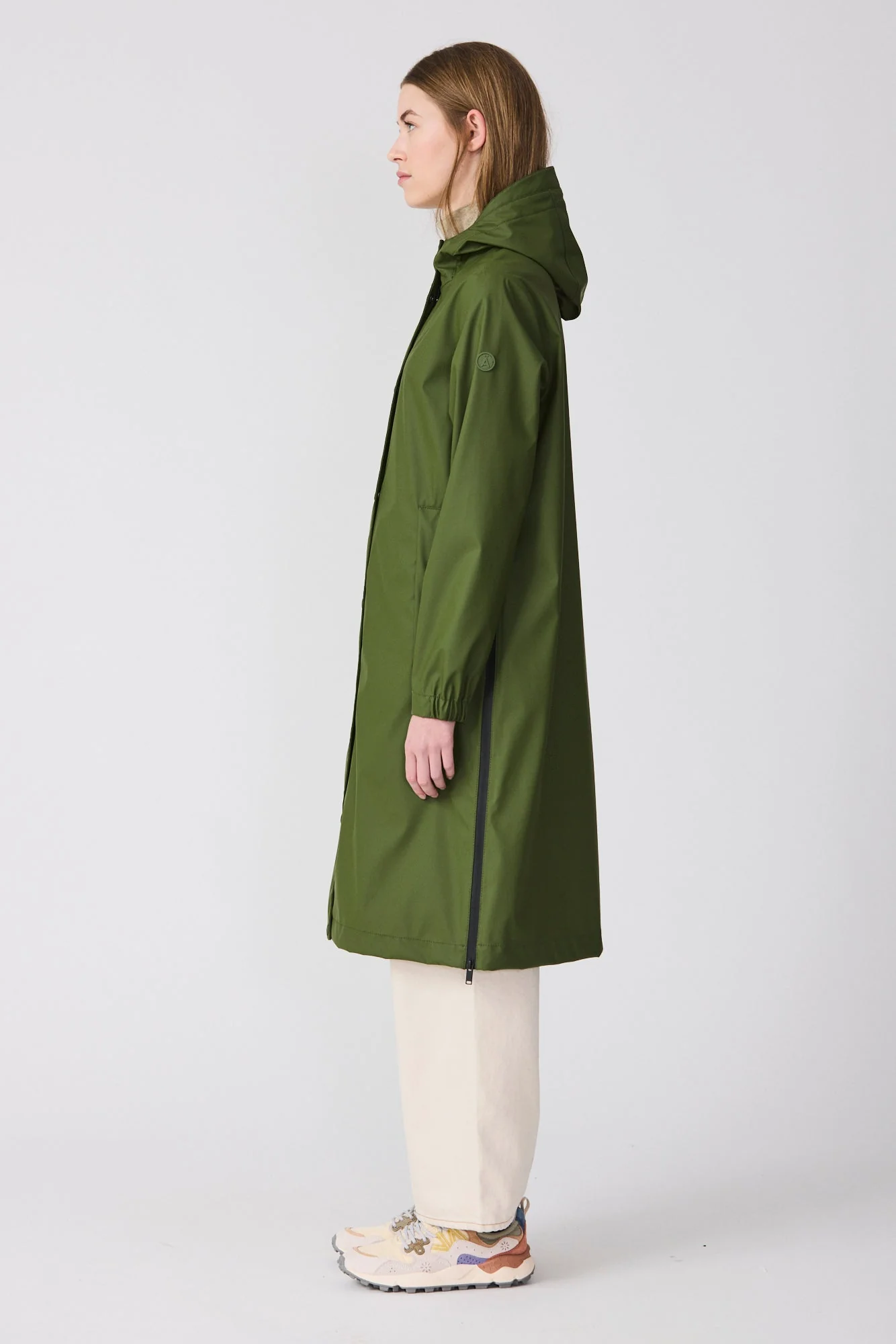Los detalles de diseño incluyen botones de presión, una cremallera frontal impermeable de doble cursor, largos bolsillos con ribete y cremalleras impermeables en los laterales con amplios fuelles internos que brindan mayor comodidad y libertad de movimiento.