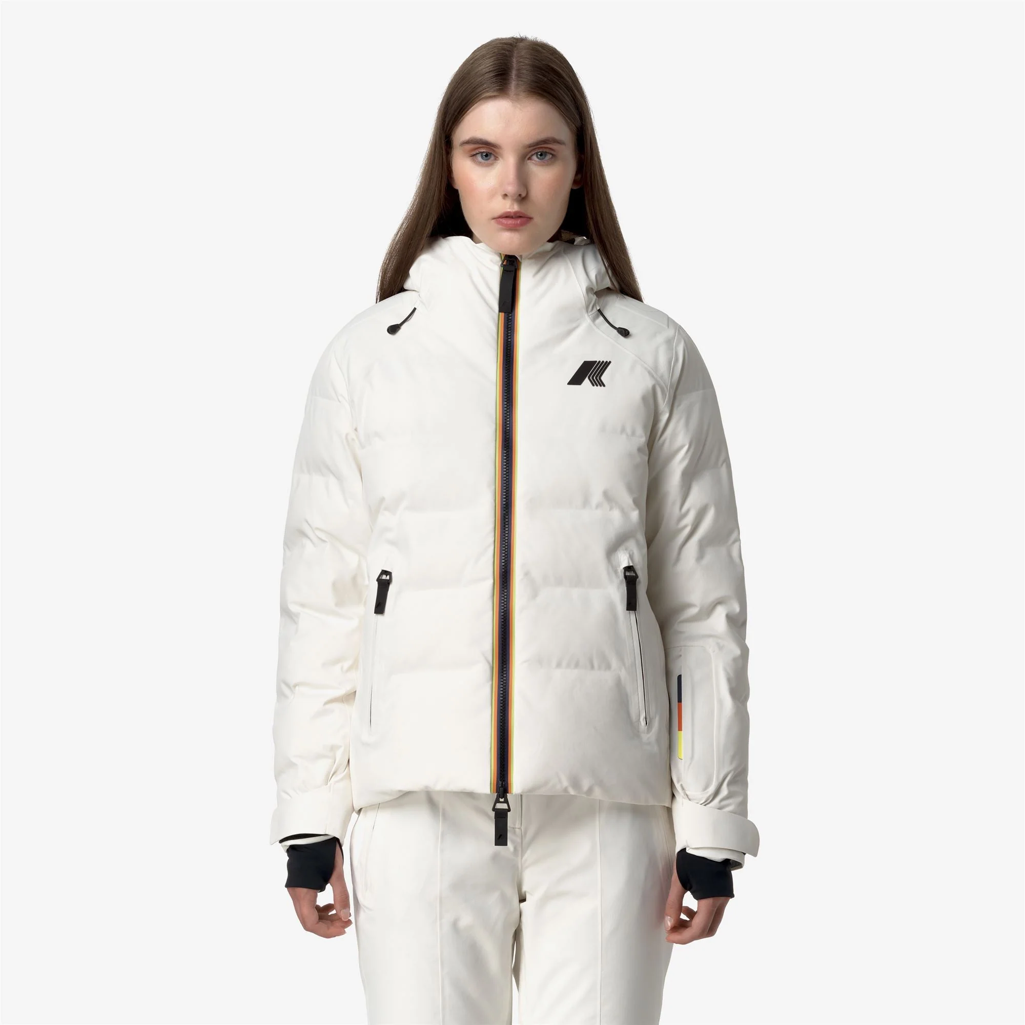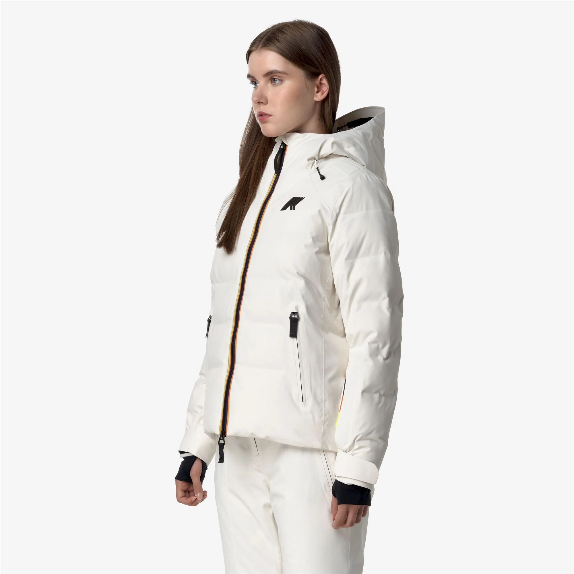 Tueda est une veste matelassée courte pour femmes, conçue pour être utilisée dans la neige et les sports d’hiver, grâce à la combinaison de la fonctionnalité K-Way et des recherches techniques avancées pour résister au froid et à l’humidité. Ce vêtement, doté d’une coque extérieure imperméable et respirante, a une coupe ajustée qui permet une liberté de mouvement lors des activités en montagne et est équipé de divers détails fonctionnels tels que rembourrage stratégique, ouvertures de ventilation, rabat coupe-vent, poignets internes élastiques avec encoches pour les pouces, capuche ajustable enveloppante, et plusieurs poches pour garder les articles essentiels, tels que le forfait de ski, à portée de main. Le rembourrage, fabriqué à partir de PrimaLoft – une fibre hautement isolante fabriquée à partir de polyester recyclé – assure un niveau élevé de chaleur, un encombrement minimal et un séchage rapide.