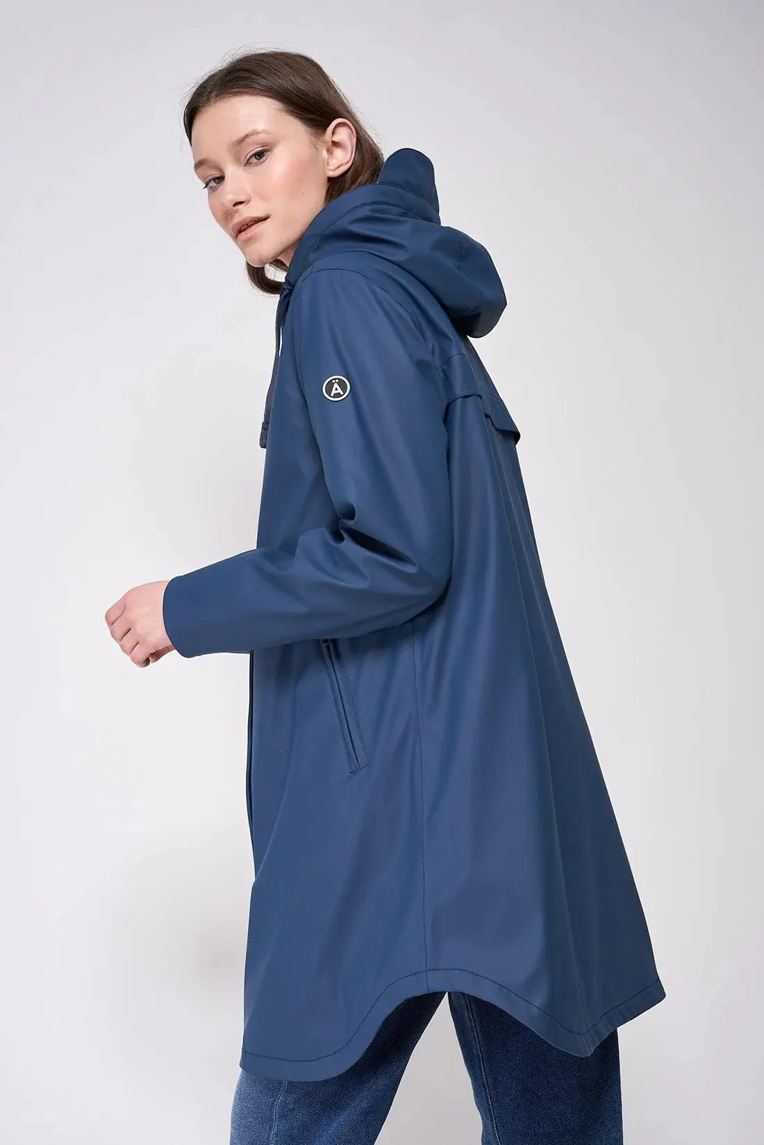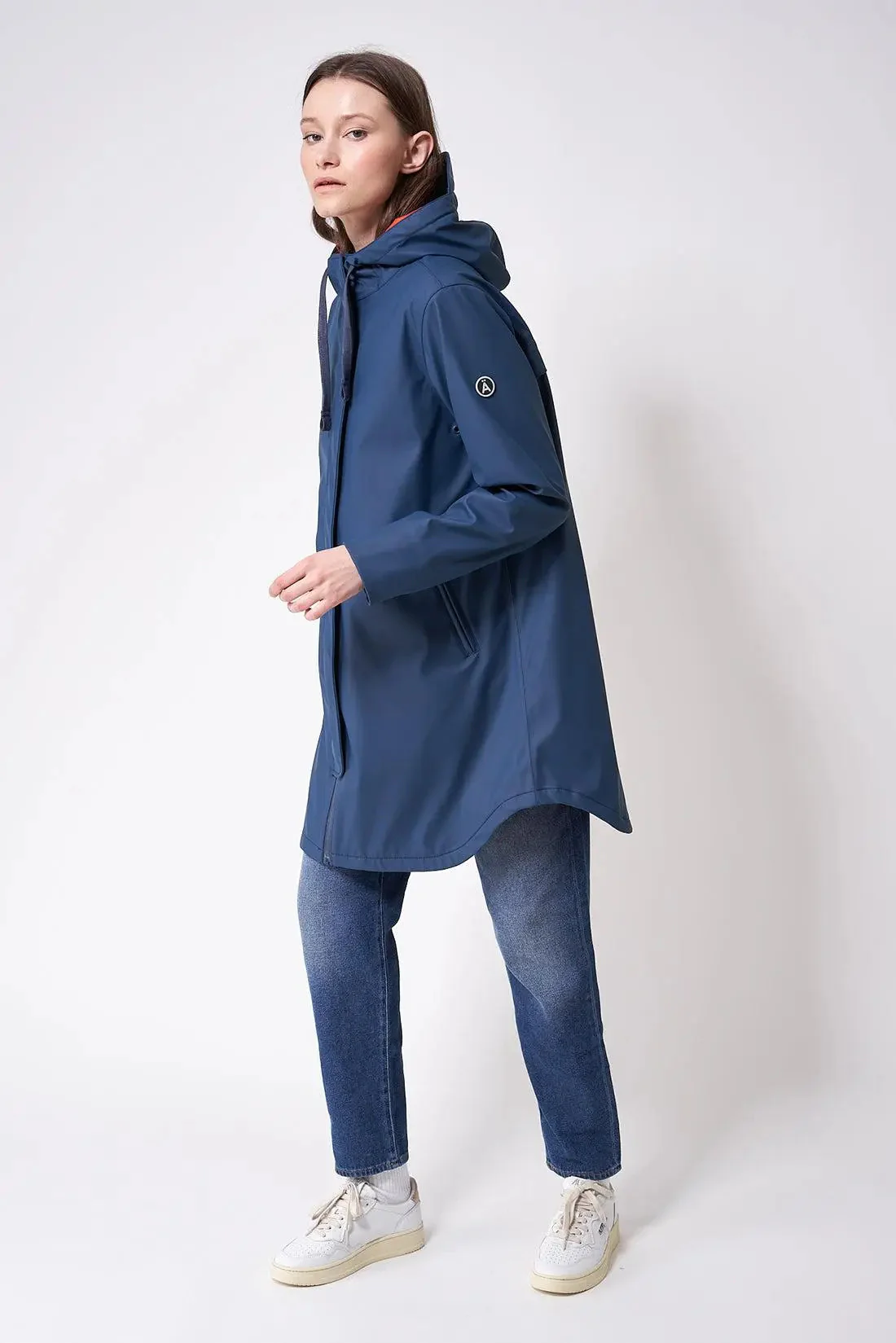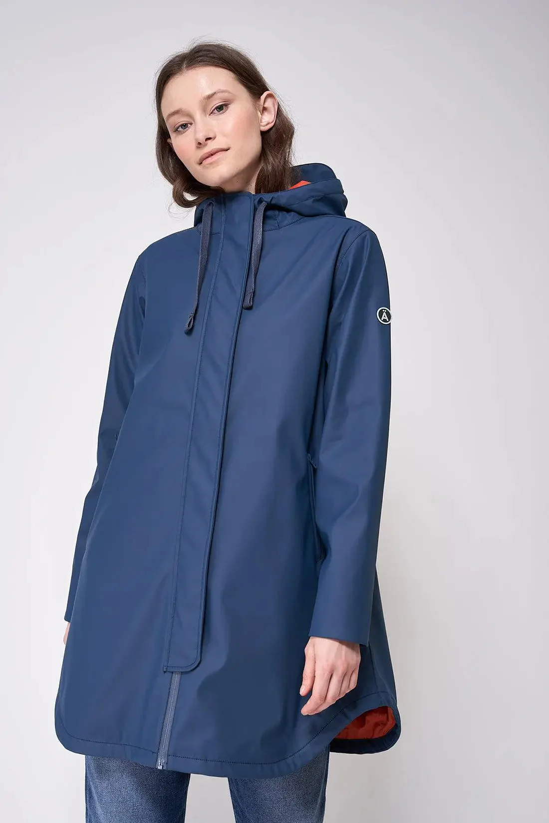 Ukkonen es un abrigo impermeable de mujer que combina una silueta en A con una forma curva en los laterales. Fabricado en poliuretano, está forrado con un aislamiento inteligente de fibra ligera tipo C que atrapa el calor corporal mientras permite que escape la humedad. Este aislamiento sin plumas y transpirable proporciona calidez y comodidad cuando la temperatura empieza a bajar. Es totalmente impermeable con todas las costuras selladas y está acabado con cierres magnéticos ocultos a presión en la parte delantera y una capucha ajustable que proporcionan una mayor protección contra la lluvia y el clima húmedo.
