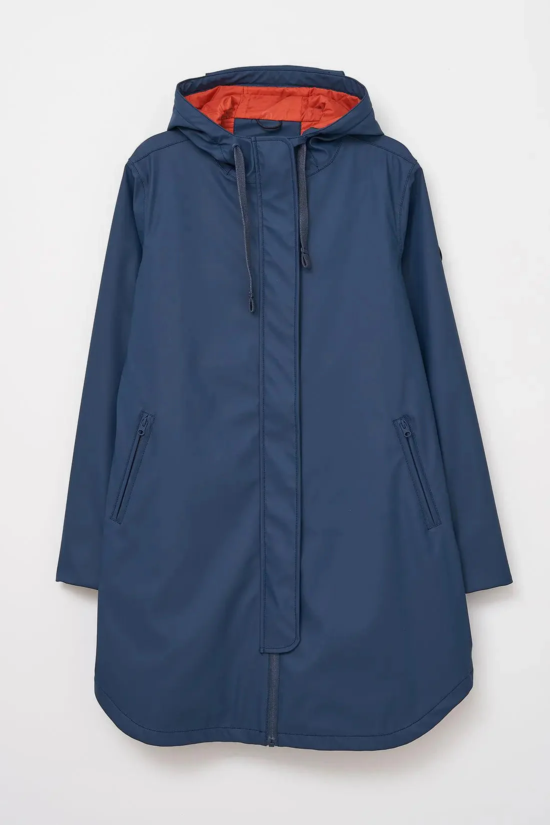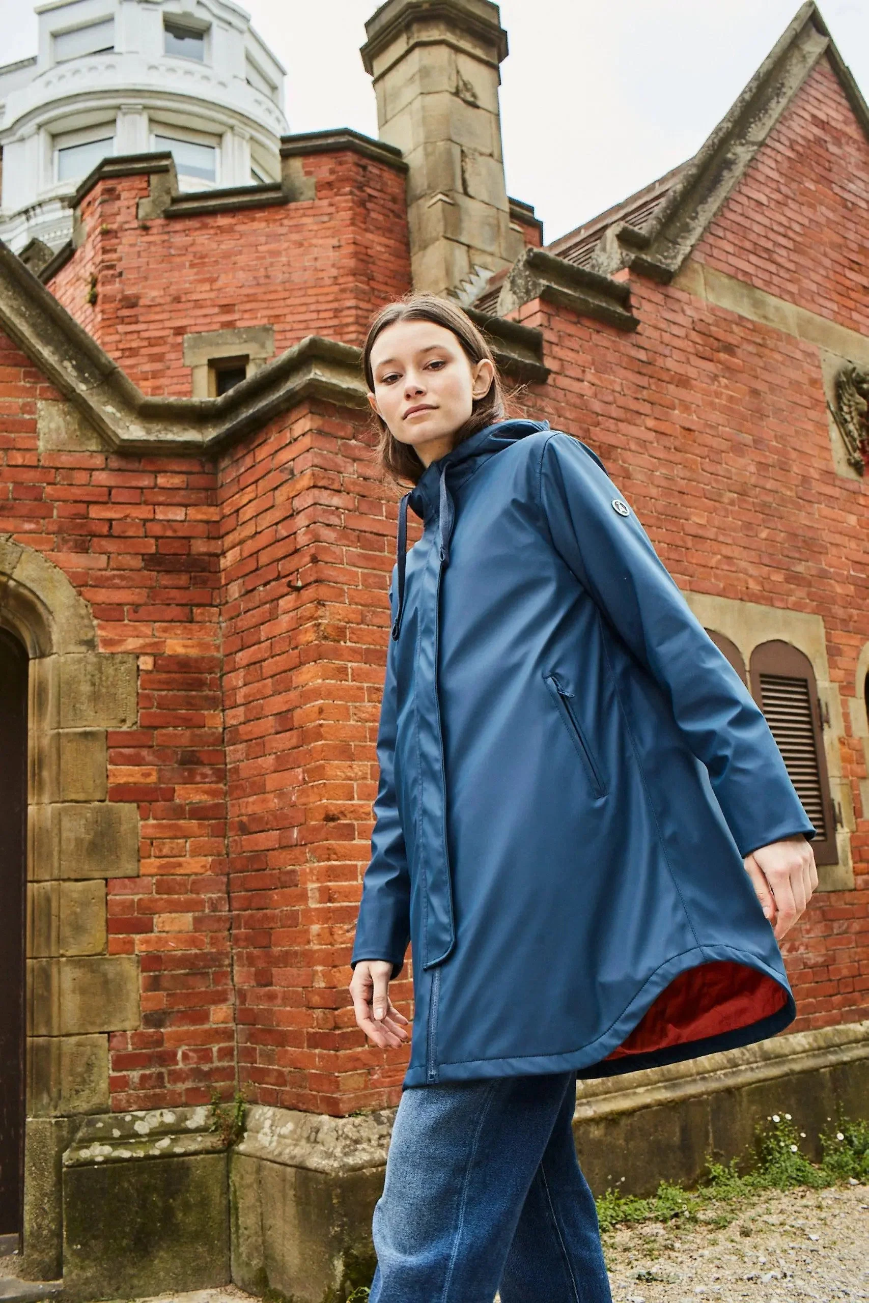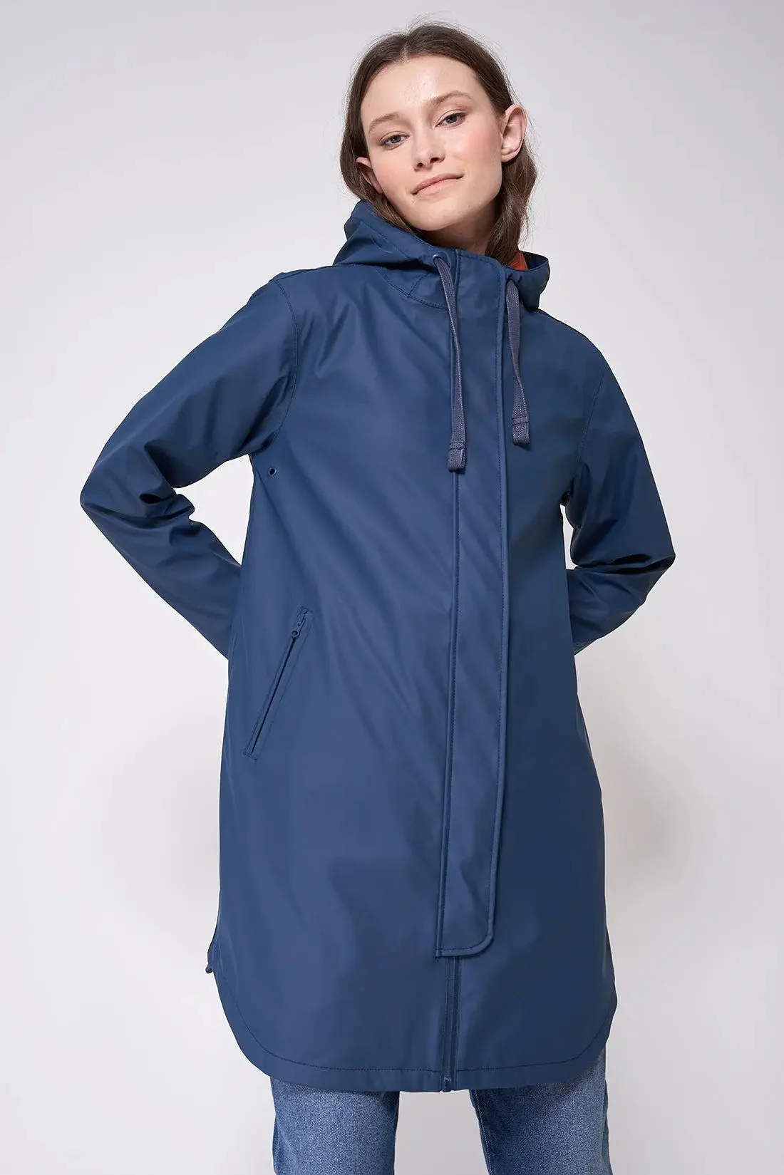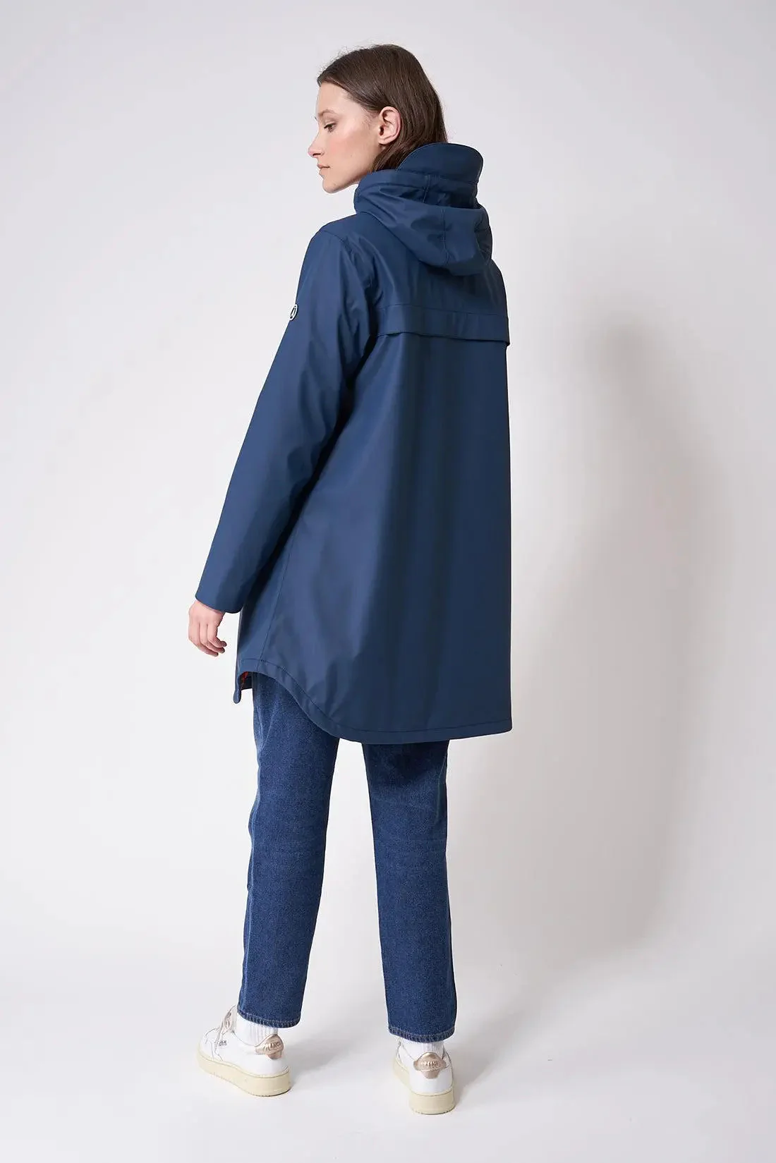Ukkonen es un abrigo impermeable de mujer que combina una silueta en A con una forma curva en los laterales. Fabricado en poliuretano, está forrado con un aislamiento inteligente de fibra ligera tipo C que atrapa el calor corporal mientras permite que escape la humedad. Este aislamiento sin plumas y transpirable proporciona calidez y comodidad cuando la temperatura empieza a bajar. Es totalmente impermeable con todas las costuras selladas y está acabado con cierres magnéticos ocultos a presión en la parte delantera y una capucha ajustable que proporcionan una mayor protección contra la lluvia y el clima húmedo.