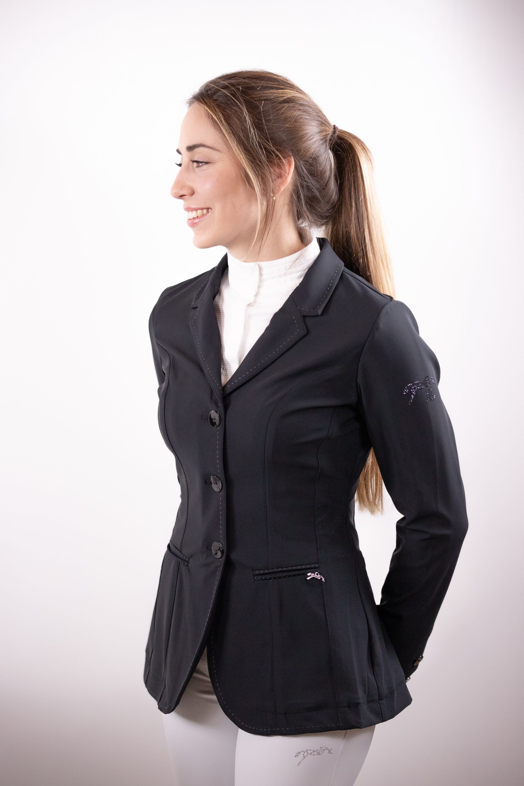 Petite note supplémentaire : Notre veste de concours Calista est dotée d’éléments décoratifs … en strass! Il est donc important d’en prendre soin et d’éviter le contact avec toute surface rugueuse lorsque vous la portez. Nous vous conseillons de ne pas utiliser d’adoucissant textile qui pourrait endommager le tissu dans lequel elle est confectionnée et de la laver dans un filet à linge.